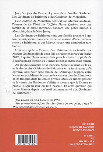 Au gré des souvenirs de sa jeunesse, Marcus revient sur la vie et le destin des Goldman-de-Baltimore et la fascination qu'il éprouva jadis pour cette famille de l'Amérique huppée, entre les vacances à Miami, la maison de vacances dans les Hamptons et les frasques dans les écoles privées. Mais les années passent et le vernis des Baltimore s'effrite à mesure que le Drame se profile. Jusqu'au jour où tout bascule. Et cette question qui hante Marcus depuis : qu'est-il vraiment arrivé aux Goldman- de-Baltimore ?