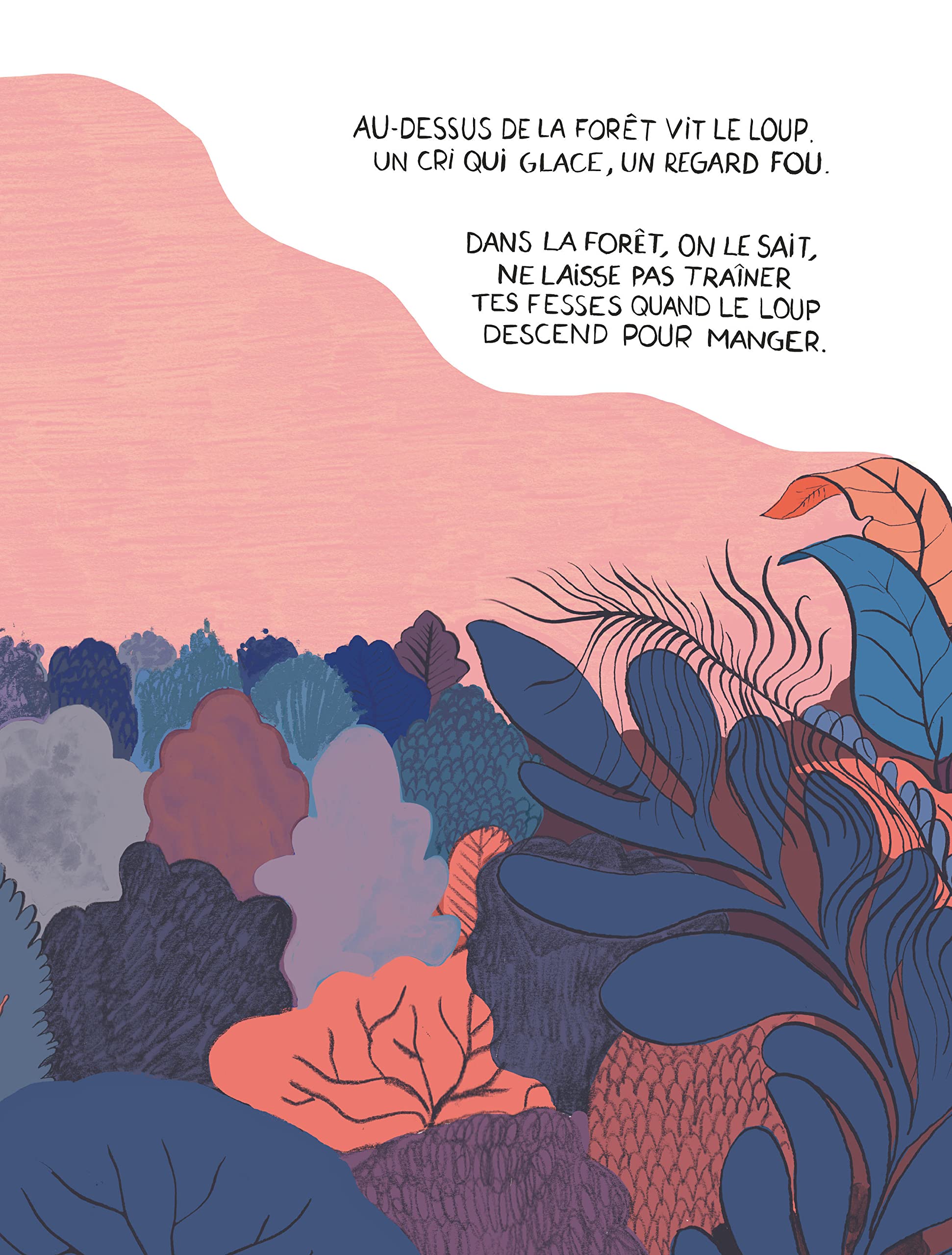 Le loup terrorise la forêt et ses habitants qui vivent continuellement dans la peur de se faire croquer les fesses. Jusqu’au jour où le loup descend dans la forêt… Méconnaissable ! Le loup ne fait plus peur du tout, il n’a plus le regard fou ni les poils dressés ! Mais comment vivre sans la peur, quand la peur est devenue l’unique moteur ?