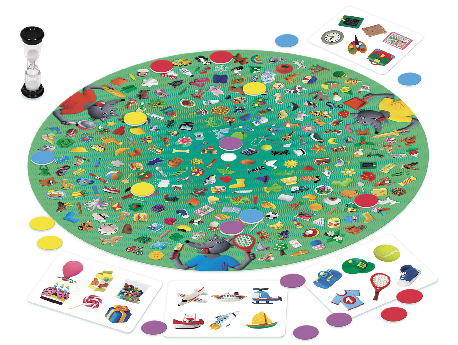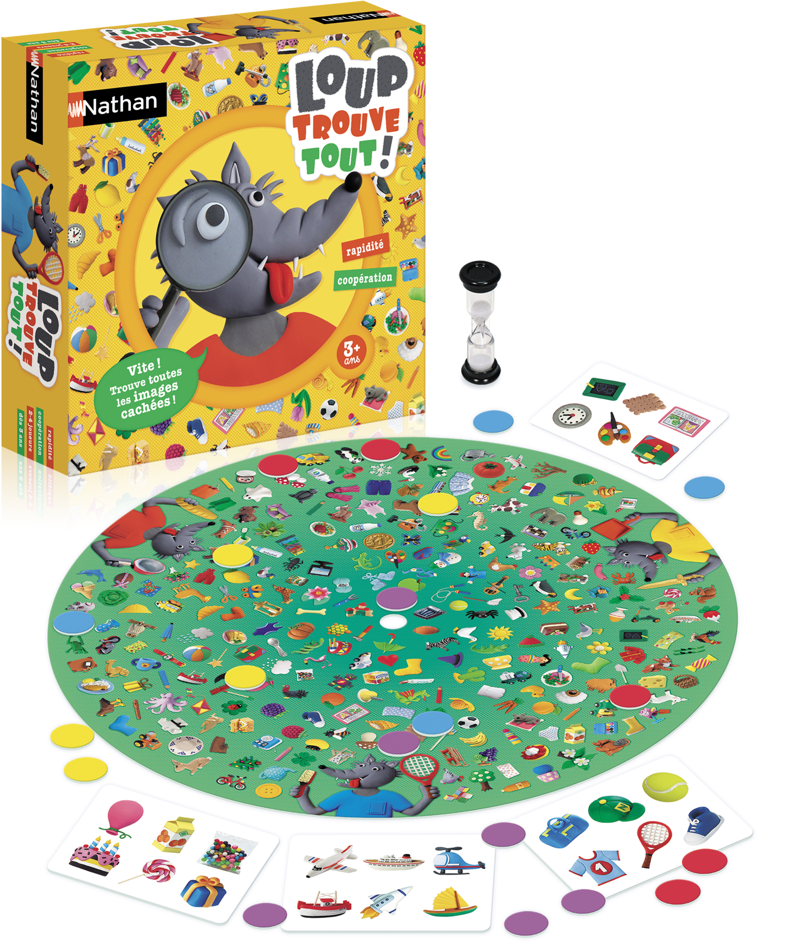 Un jeu de cherche et trouve avec 2 modes de jeux :coopératif et compétitif. On retourne et sablier et on joue tous ensemble! Un joueur retourne une planche et dés quun joueur trouve limage sur le plateau il pose un jeton sur la planche. Si les joueurs ont trouvé les 12 images avant que le temps soit écoulé, ils ont gagné. Sinon, cest le Loup qui gagne, car il avait bien caché les objets ! Chacun sa planche, le premier qui retrouve les image indiquées sur sa plache remporte la manche !