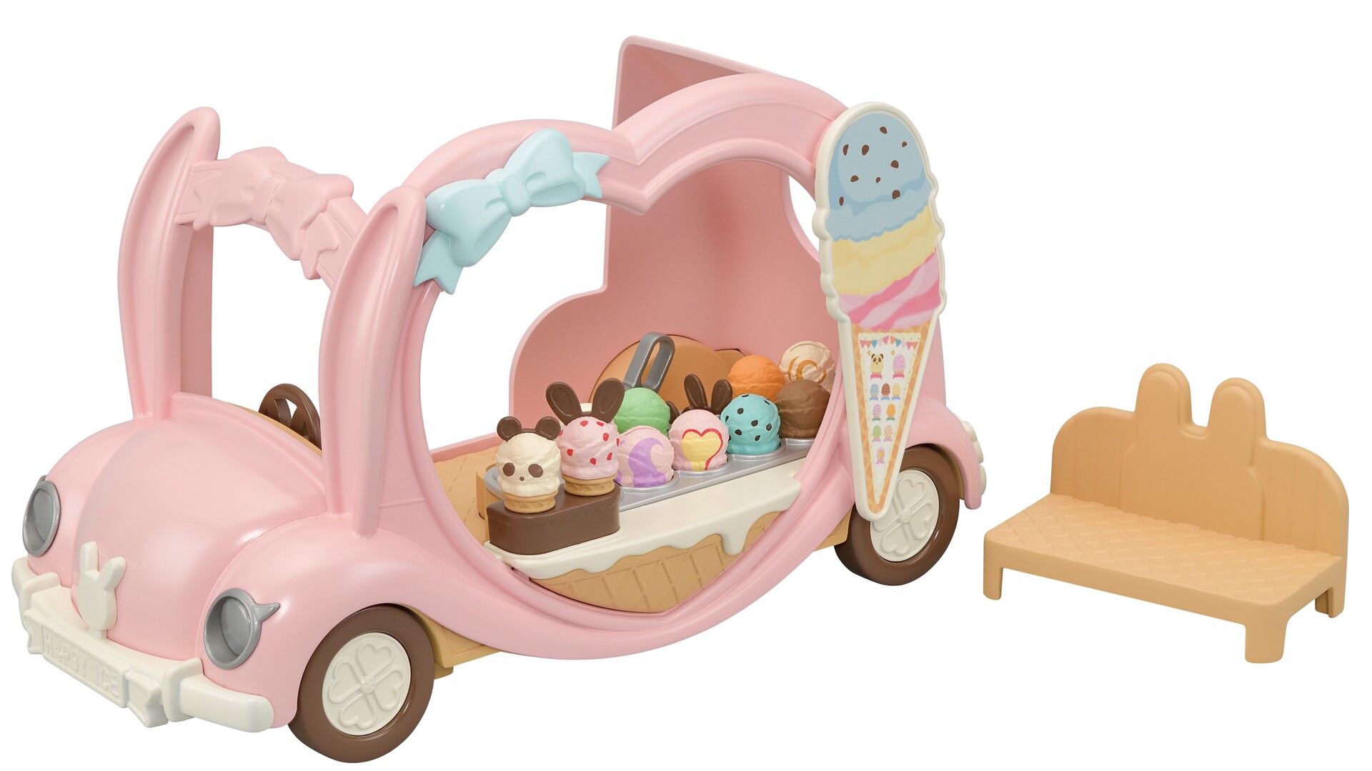 Le camion du marchand de glace ambulant contient plus de 30 glaces et accessoires. Les cornets peuvent être tenus par les figurines. Le siège conducteur peut être retiré et utilisé comme banquette. La vitrine peut être retournée et utilisée comme siège.
