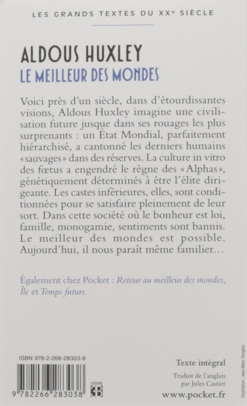 Voici près d'un siècle, dans d'étourdissantes visions, Aldous Huxley imagine une civilisation future jusque dans ses rouages les plus surprenants : un État Mondial, parfaitement hiérarchisé, a cantonné les derniers humains " sauvages " dans des réserves. La culture in vitro des fœtus a engendré le règne des " Alphas ", génétiquement déterminés à être l'élite dirigeante. Les castes inférieures, elles, sont conditionnées pour se satisfaire pleinement de leur sort. Dans cette société où le bonheur est loi, famille, monogamie, sentiments sont bannis. Le meilleur des mondes est possible. Aujourd'hui, il nous paraît même familier...