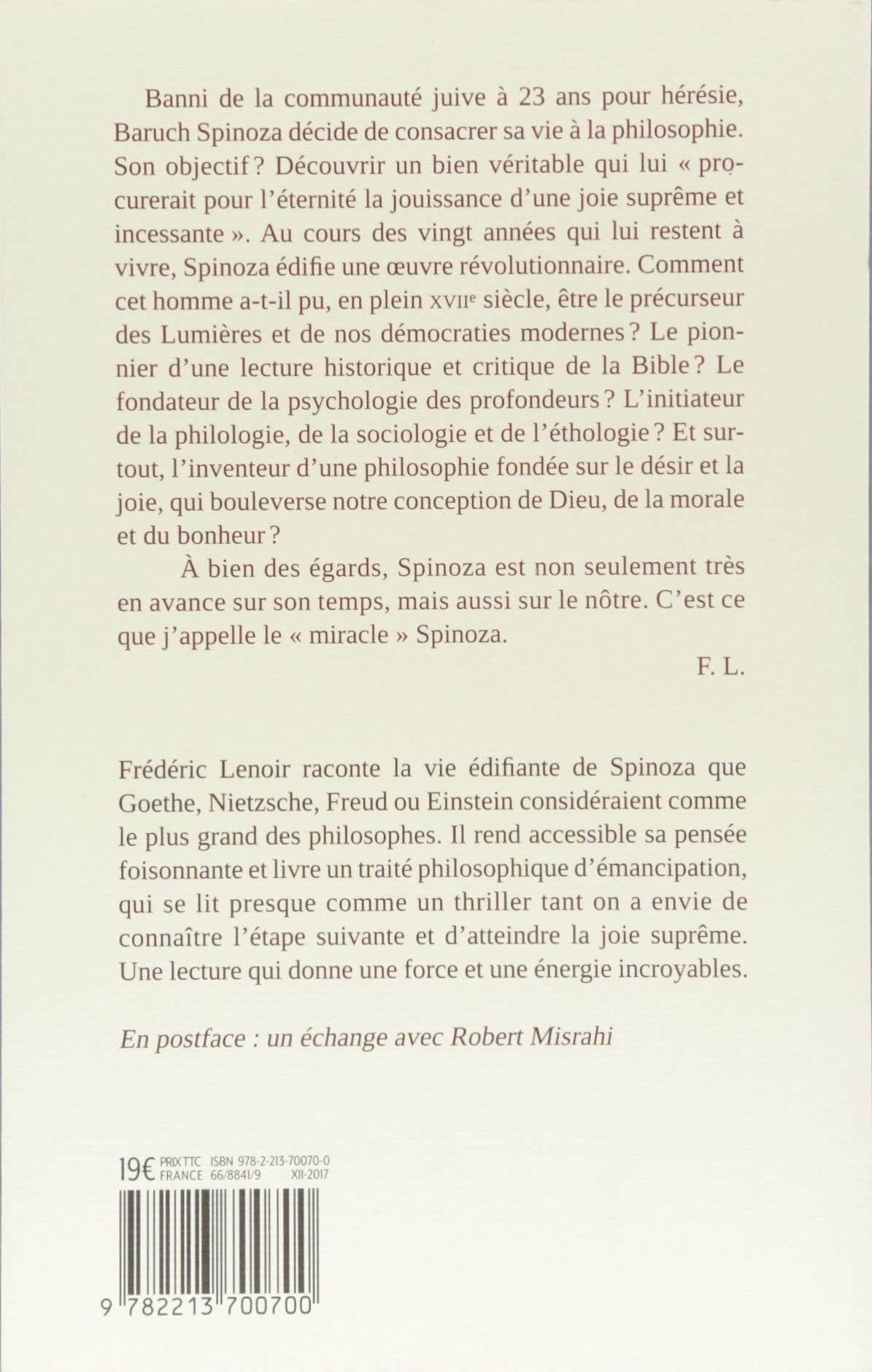 Frédéric Lenoir raconte la vie édifiante de Spinoza que Goethe, Nietzsche, Freud ou Einstein considéraient comme le plus grand des philosophes. Il rend accessible sa pensée foisonnante et livre un traité philosophique d'émancipation, qui se lit presque comme un thriller tant on a envie de connaître l'étape suivante et d'atteindre la joie suprême. Une lecture qui donne une force et une énergie incroyables.