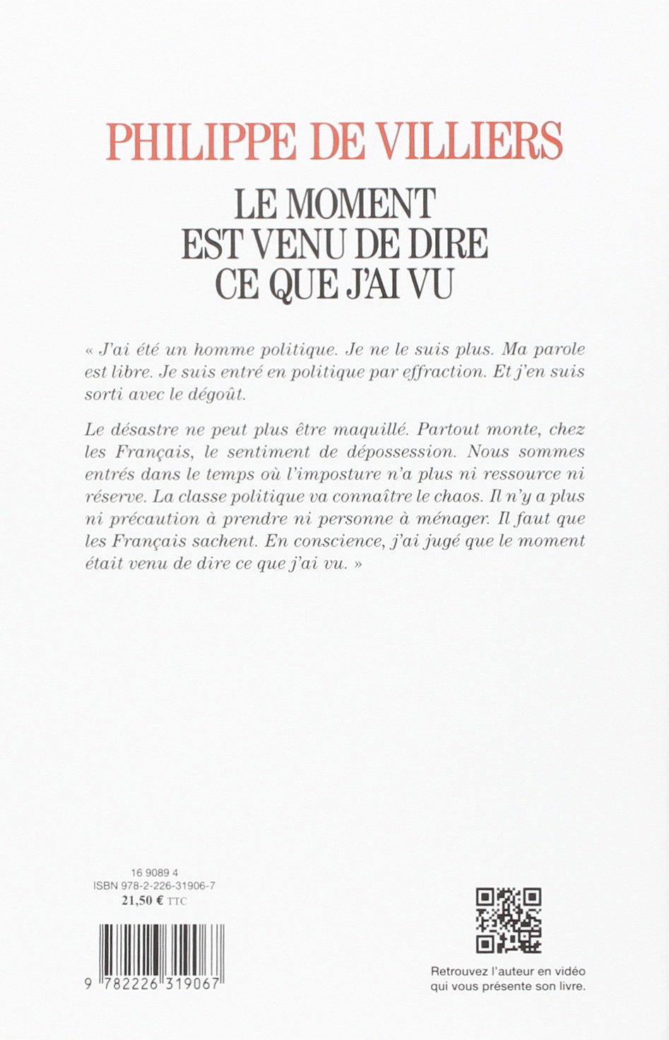 Le désastre ne peut plus être maquillé. Partout monte, chez les Français, le sentiment de dépossession. Nous sommes entrés dans le temps où l'imposture n'a plus ni ressource ni réserve. La classe politique va connaître le chaos. Il n'y a plus ni précaution à prendre ni personne à ménager. Il faut que les Français sachent. En conscience, j'ai jugé que le moment était venu de dire ce que j'ai vu. »
