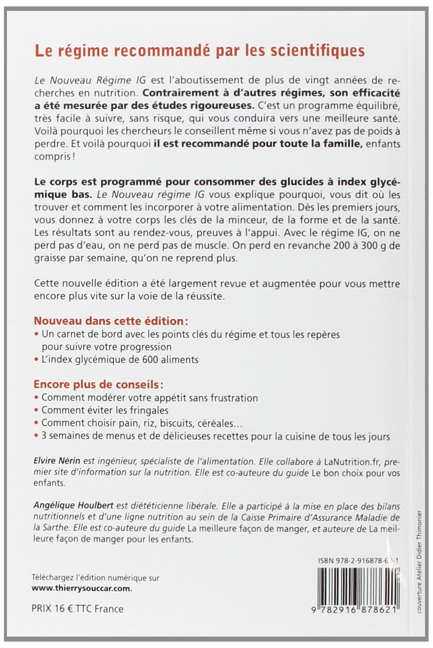 Le corps est programmé pour consommer des glucides à index glycémique bas. Le Nouveau régime IG vous explique pourquoi, vous dit où les trouver et comment les incorporer à votre alimentation. Dès les premiers jours, vous donnez à votre corps les clés de la minceur, de la forme et de la santé. Les résultats sont au rendez-vous, preuves à l'appui. Avec le régime IG, on ne perd pas d'eau, on ne perd pas de muscle. On perd en revanche 200 à 300 g de graisse par semaine, qu'on ne reprend plus.