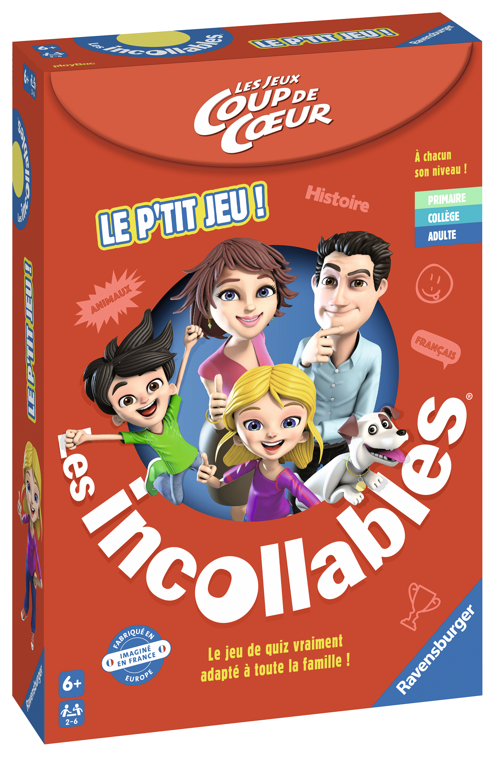 Plus produit DES RÈGLES SIMPLES pour toute la famille. Dans ce jeu, vous devez être le premier à reconstituer votre personnage composé de 6 tuiles. Répondez correctement à des questions ou réalisez des défis pour remporter des cartes, que vous pourrez échanger par la suite contre des tuiles de votre personnage. ADAPTÉ À TOUT LA FAMILLE : le jeu est accessible à partir de 6 ans. Choisissez la difficulté de votre question pour chaque membre de la famille en fonction de la thématique : Primaire, Collège ou Adulte. De cette manière le jeu et équilibré entre tous les joueurs ! FUN ET INSTRUCTIF : parfois entre les questions, des défis complètement fous vont venir ponctuer la partie. Les conditions pour gagner la carte Défi change d\'un Défi à l\'autre alors restez concentrer ! Qui sera le premier à reconstituer son personnage et va remporter la partie ? LES INCOLLABLES : Le p\'tit jeu des Incollables - Coup de cur est un grand jeu dans un petit format, à emmener partout. Retrouvez également dans la collection des Incollables : le grand jeu famillial, le jeu des Enigmes, le jeu des 7 familles ou encore le p\'tit bac des Incollables. CONTENU : 96 cartes questions réparties en 6 thématiques (Maths-Français, Histoire, Citoyenneté, Découverte du monde, Loisirs, Animaux), 14 cartes Défis, 1 roue à monter, 6 sets de tuiles représentant chacun un personnage, 1 règle du jeu. Plus de 600 questions et défis hilarants.