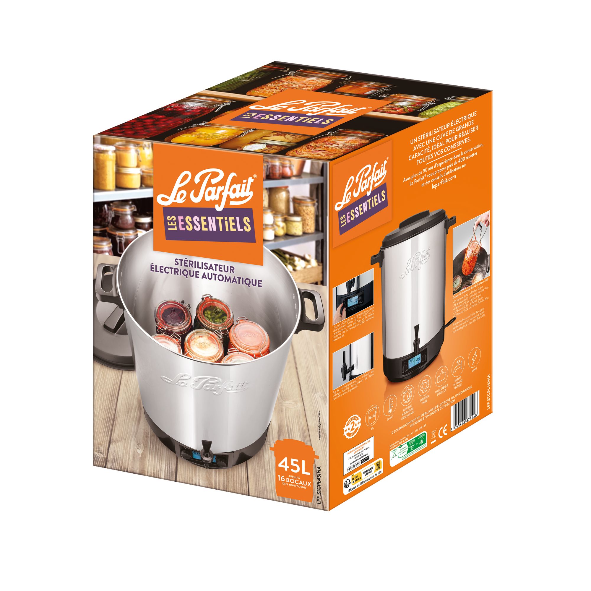 Découvrez notre nouveau stérilisateur électrique et automatique Le Parfait®, avec une cuve de 45L pour vous accompagner quels que soient vos besoins ! Esthétique avec une cuve en inox brillant, des poignées thermo-isolantes, un couvercle en plastique noir, un robinet de vidange et son écran d'affichage LCD avec minuterie automatique, faire vos propres bocaux n'aura jamais été aussi facile ! L'écran d'affichage vous permet de sélectionner la température souhaitée jusqu'à 100° C ainsi que la durée de cuisson. La minuterie intégrée (180 minutes maximum) se déclenchera automatiquement une fois la température souhaitée atteinte. Capacité maximum : • 16 bocaux de 1L Le Parfait Super • 16 bocaux de 1L Le Parfait Familia Wiss • 8 bocaux 1,5L Le Parfait Super • 32 bocaux 0,5L Le Parfait Super • 32 bocaux 0,5L Le Parfait Familia WissLa grille fournie est à placer dans le fond de l'appareilAppareil garanti 2 ansCuve intérieure: Diamètre 37cm et Hauteur 43cmLavage à la main