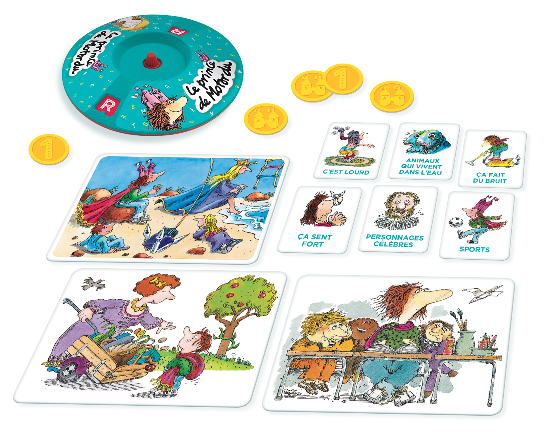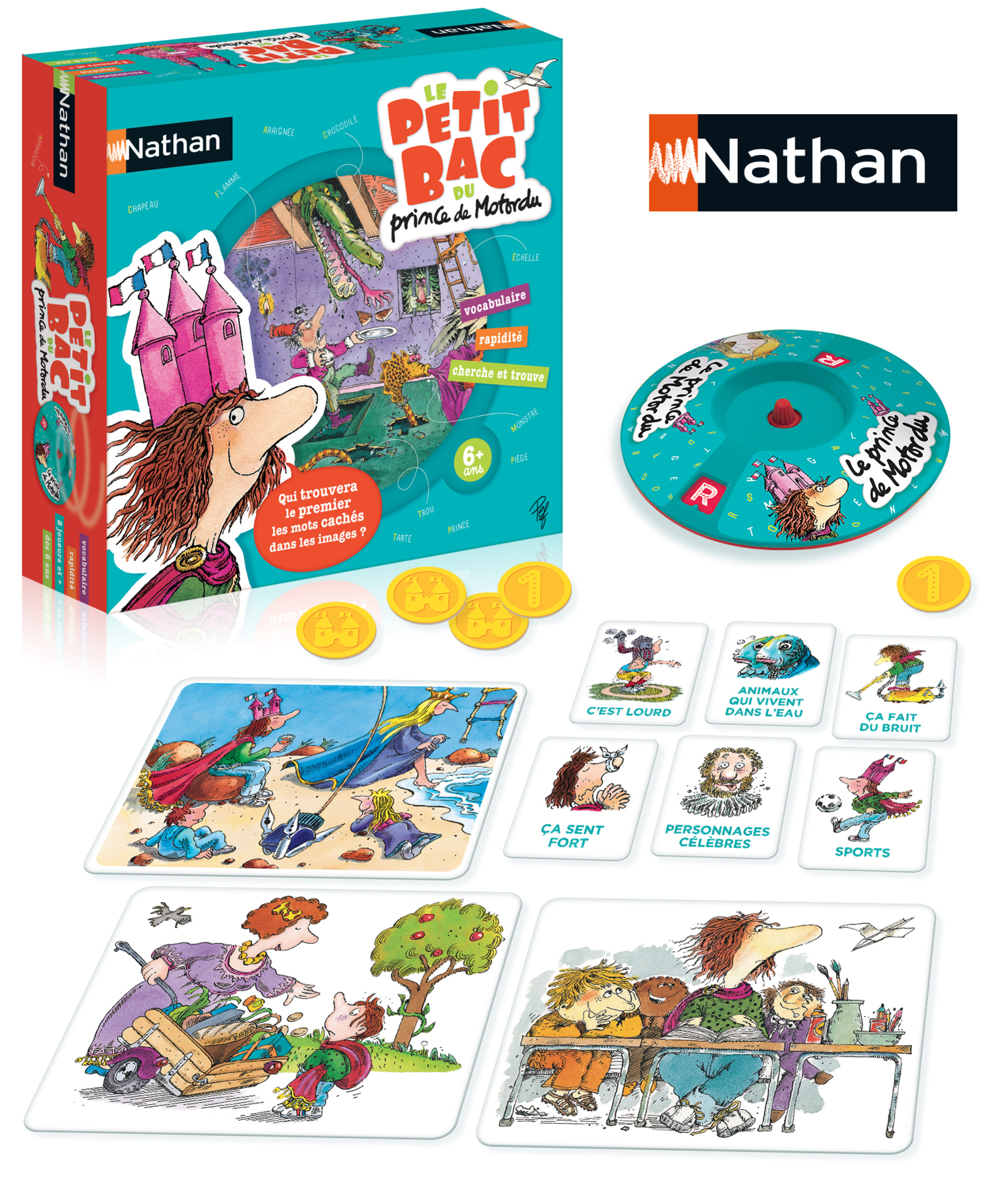 Deux jeux évolutifs pour samuser à trouver des mots le plus vite possible, à partir de l'univers du Prince de Motordu. -Cherche et trouve : les joueurs cherchent dans 3 grandes images un mot qui commence par la lettre indiquée par la roue. - Le petit bac : les joueurs doivent trouver des mots qui commencent par la lettre, dans 6 thèmes très rigolos : "ça sent fort", "ça pique", "ça fait peur"...le plus vite possible, à partir de lunivers du Prince de Motordu . Cherche et trouve: les joueurs cherchent dans 3 grandes images un mot qui commence par la lettre indiquée par la roue . Le petit bac: les joueurs doivent trouver des mots qui commencent par la lettre, dans 6 thèmes très rigolos: «ça sent fort», « ça pique», « ça fait peur»