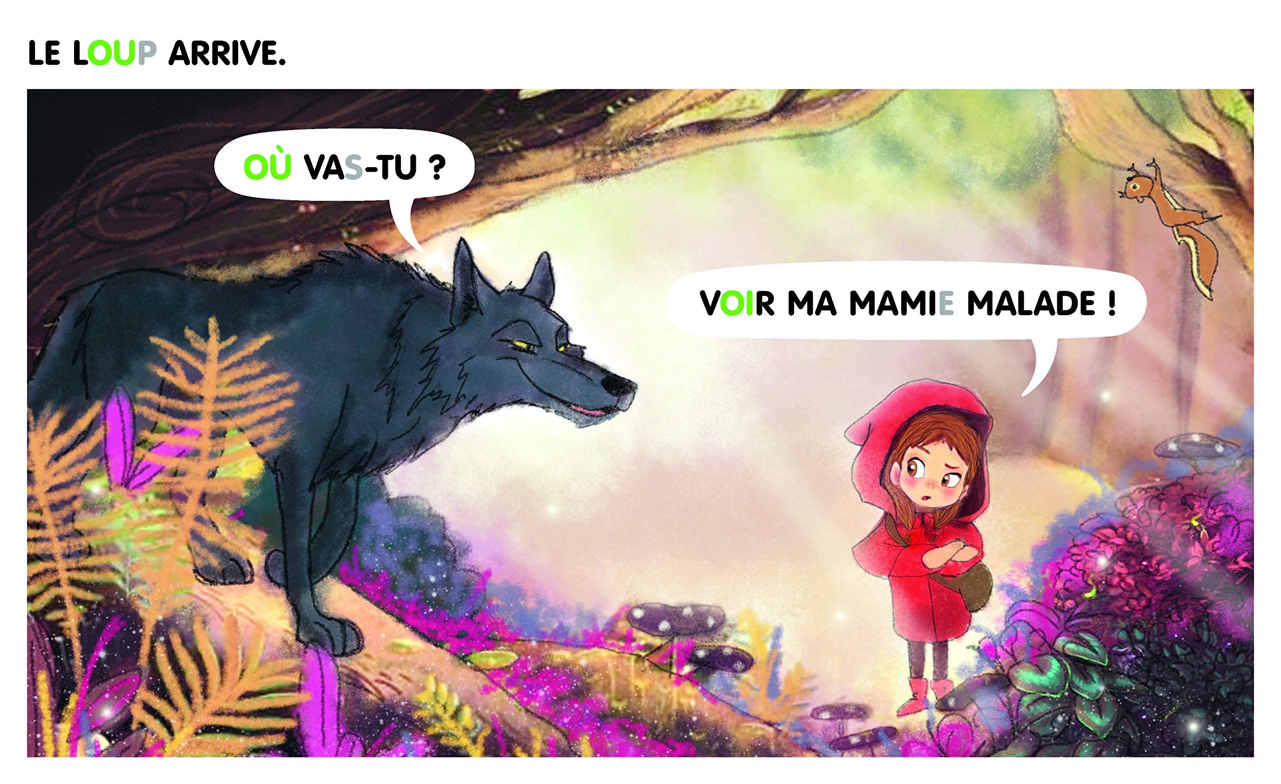 Lettres muettes en gris pour repérer les lettres qui ne se prononcent pas. Digrammes en vert pour signaler les paires de lettres qui produisent un son. Onomatopées pour un premier niveau de lecture très simple. Dès que l'enfant connaît le son des lettres et des principaux digrammes (OU, AN, ON...), il peut lire son premier livre ! Capitales pour faciliter la reconnaissance des lettres. Bulles pour désigner qui parle.