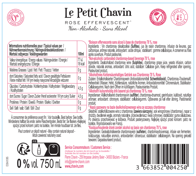 | Dénomination | LE PETIT CHAVIN ROSE EFFERVESCENT - Boisson effervescente sans alcool à base de Chardonnay 78%, rosé |