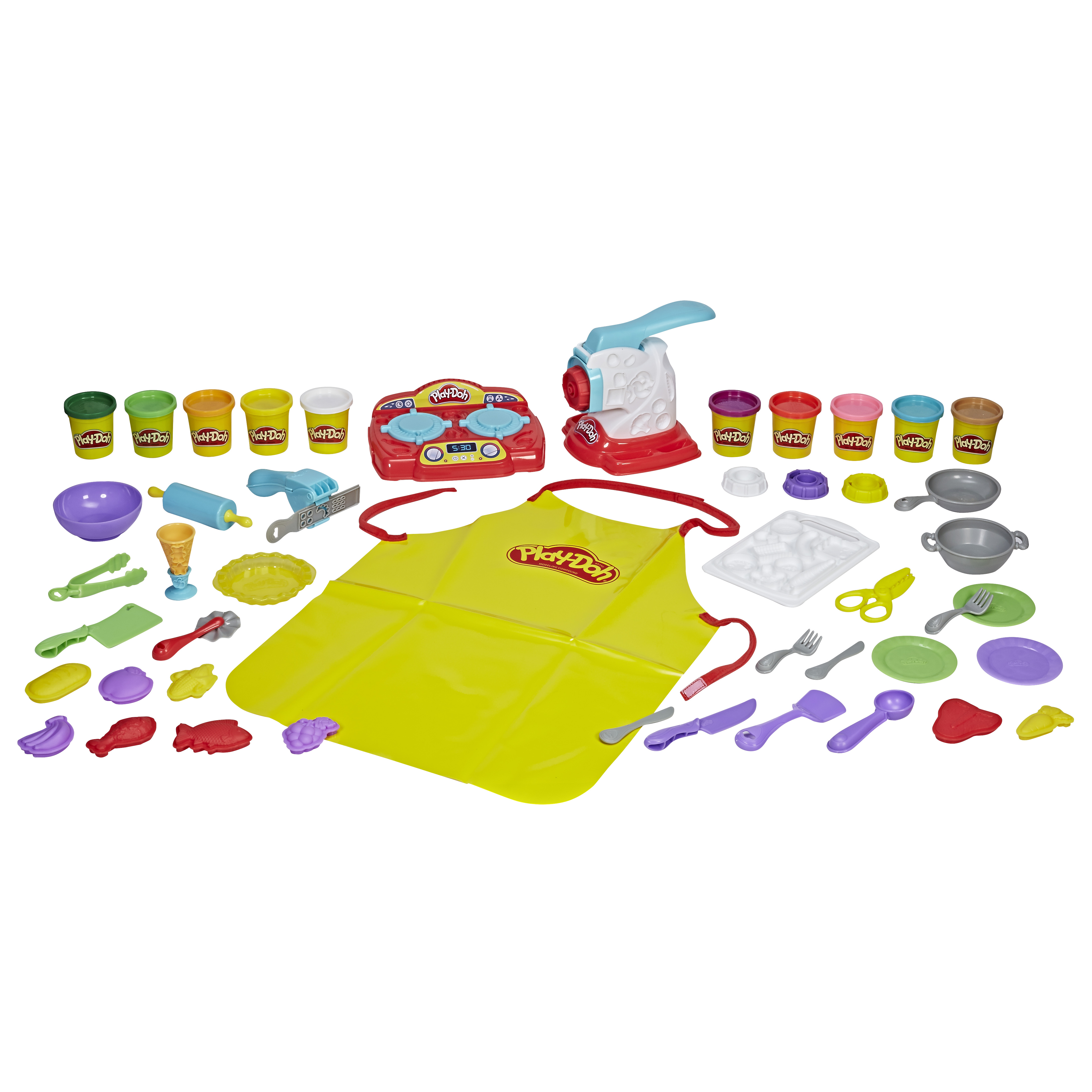Mettez votre tablier et préparez le plus grand buffet que vous puissiez imaginer avec la pâte à modeler Play-Doh ! Avec cette expérience complète de la cuisine, les chefs en herbes ont tout ce dont ils ont besoin pour développer leurs imaginaires. Les enfants auront fière allure avec leur tablier ! Pour rendre l'expérience des plus réalistes, la plaque chauffante électronique émet des sons de grésillement lorsque les enfants s'amusent à préparer leurs repas, et la machine à pâtes presse différentes sortes de nouilles pour créer des montagnes de plats de pâtes. L'ensemble inclut de nombreux ustensiles de cuisine dont un rouleau et une planche à découper, de même qu'un guide remplit d'idées pour créer différentes plats, gâteaux étape par étape. L'ensemble est offert dans une boîte colorée facile à ouvrir qui permet de ranger toutes les pièces une fois le jeu terminé. Le petit traiteur Play-Doh ne requiert que l'imagination des petits chefs!
