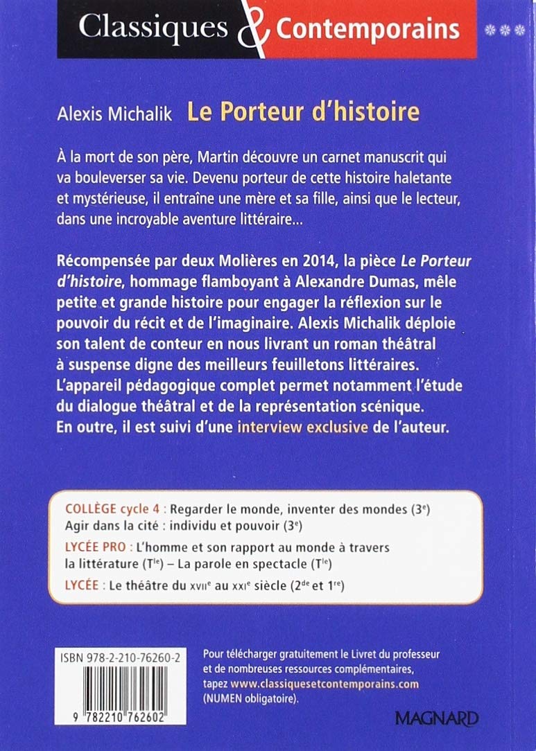 Récompensée par deux Molières en 2014, la pièce Le Porteur d’histoire, hommage flamboyant à Alexandre Dumas, mêle petite et grande histoire pour engager la réflexion sur le pouvoir du récit et de l’imaginaire. Alexis Michalik déploie son talent de conteur en nous livrant un roman théâtral à suspense digne des meilleurs feuilletons littéraires. L’appareil pédagogique complet permet notamment l’étude du dialogue théâtral et de la représentation scénique. En outre, il est suivi d’une interview exclusive de l’auteur.