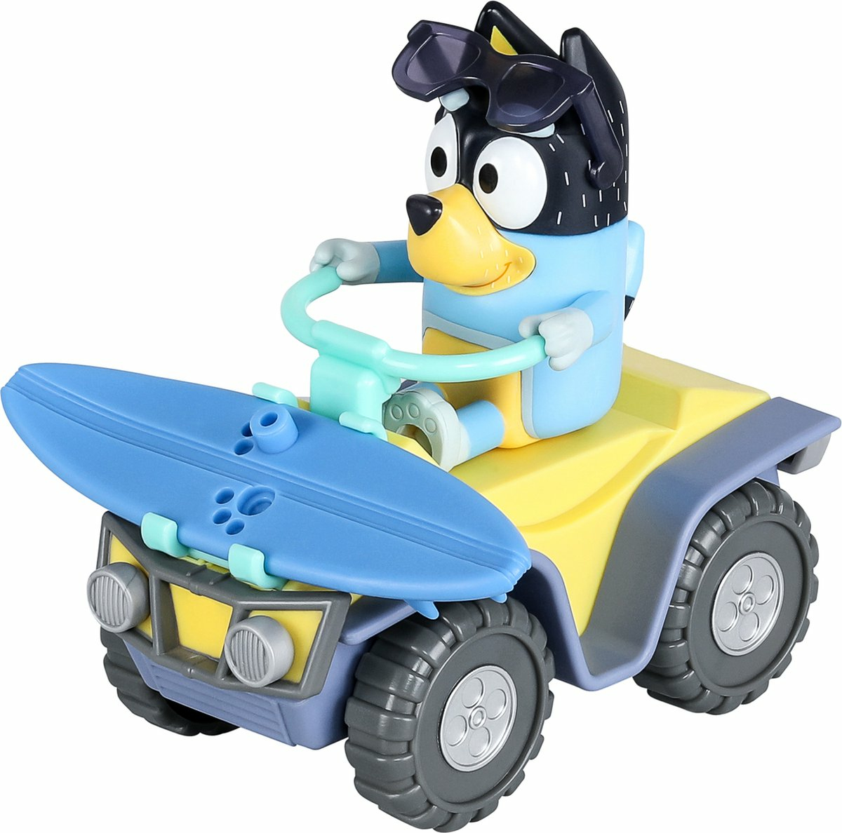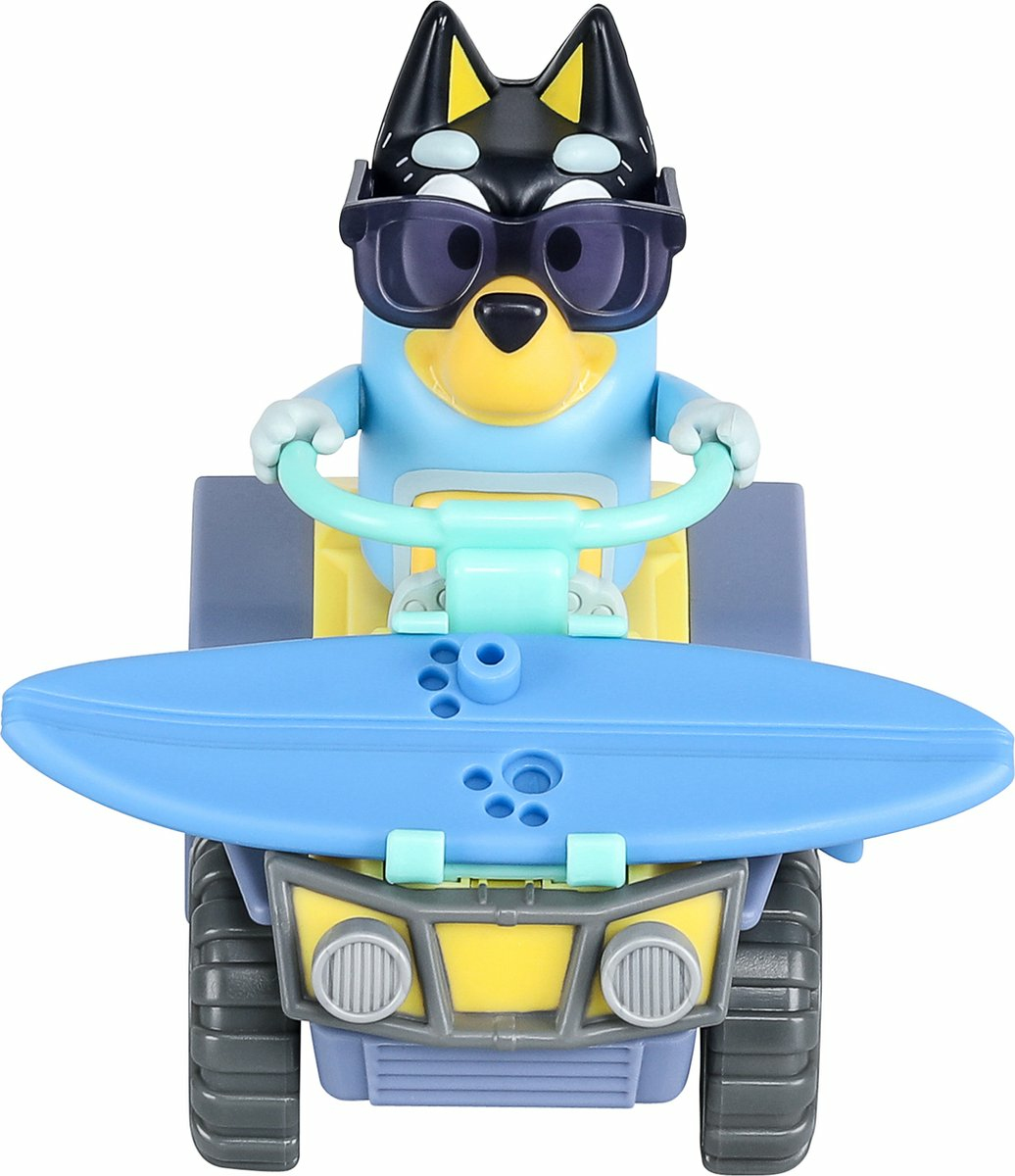 Découvre le quad de plage de Bluey. Il inclut une figurine de Bandit, le papa de Bluey, une paire de lunette de soleil et une planche de surf.