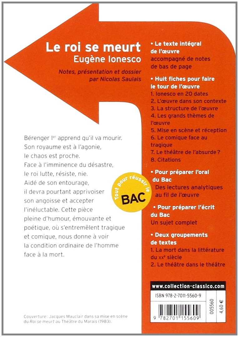 Dossier pédagogique de Nicolas Saulais Bérenger Ier apprend qu'il va mourir. Son royaume est à l'agonie, le chaos est proche. Face à l'imminence du désastre, le roi lutte, résiste, nie. Aidé de son entourage, il devra pourtant apprivoiser son angoisse et accepter l'inéluctable. Cette pièce pleine d'humour, émouvante et poétique, où s'entremêlent tragique et comique, nous donne à voir la condition ordinaire de l'homme face à la mort. Groupements de textes : 1. La mort dans la littérature du xxe siècle 2. Le théâtre dans le théâtre