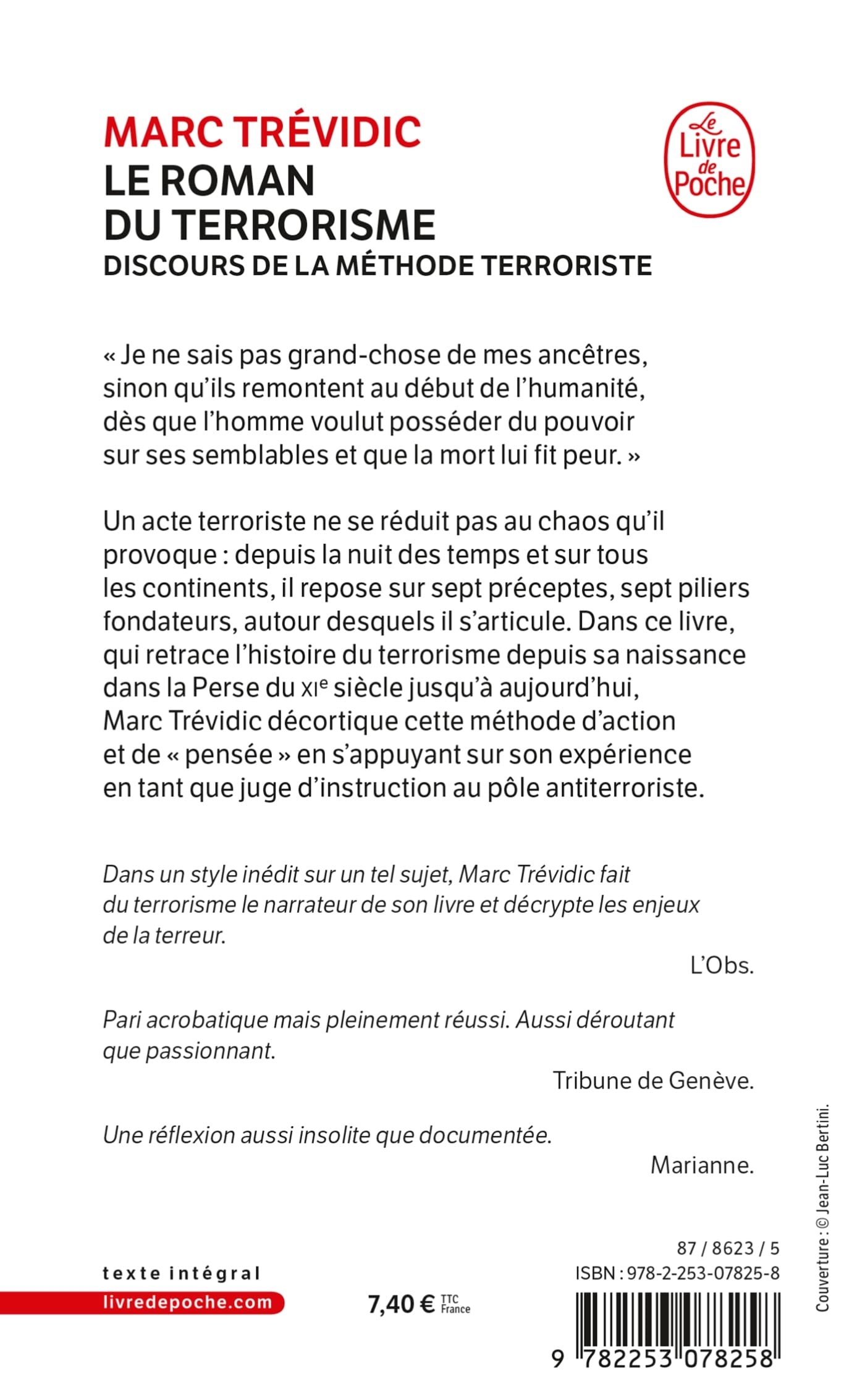 Un acte terroriste ne se réduit pas au chaos qu'il provoque : depuis la nuit des temps et sur tous les continents, il repose sur sept préceptes, sept piliers fondateurs, autour desquels il s'articule. Dans ce livre, qui retrace l'histoire du terrorisme depuis sa naissance dans la Perse du XIe siècle jusqu'à aujourd'hui, Marc Trévidic décortique cette méthode d'action et de « pensée » en s'appuyant sur son expérience en tant que juge d'instruction au pôle antiterroriste.