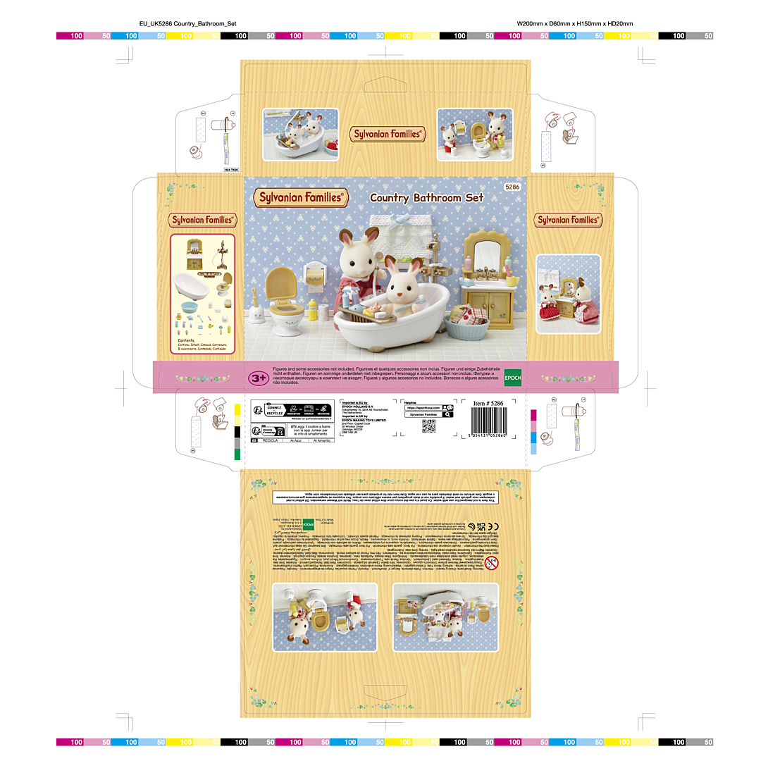 | La boîte contient | 1 baignoire avec 1 panier, 1 douche, 1 meuble de rangement avec lavabo, 1 cuvette de toilettes avec abattant, 1 porte-rouleaux avec 2 rouleaux de papier toilette, 1 panier à linge, 1 multitude d'accessoires : jouets pour le bain, flacons, etc... Plus de 20 pièces |