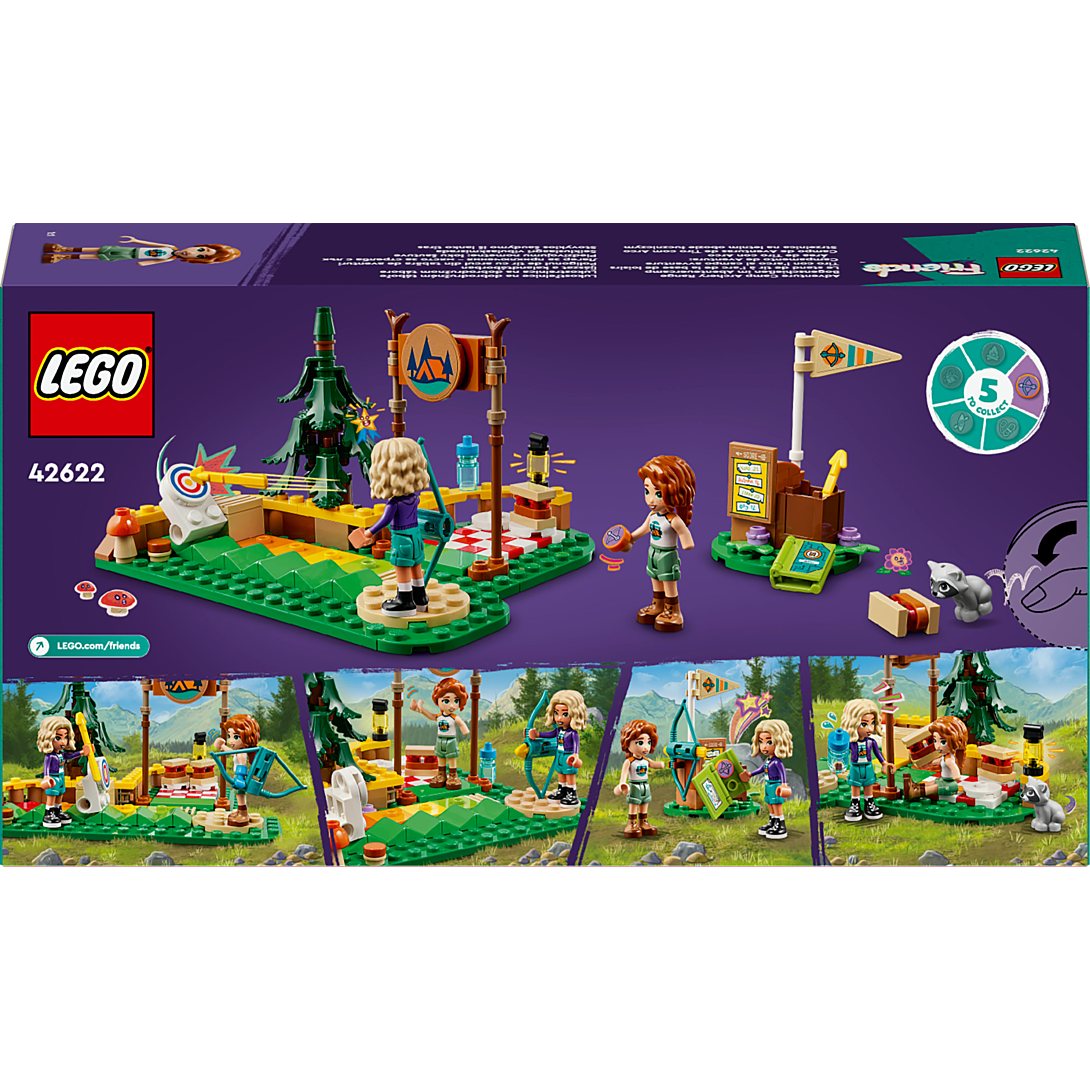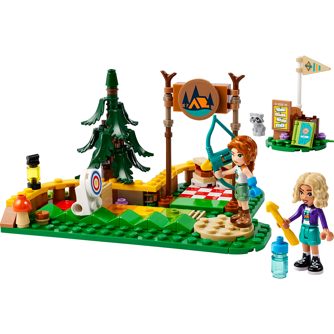 Plus produit Le stand de tir à l\'arc à la base de loisirs LEGO® Friends pour enfants inclut 2 mini-poupées, un raton laveur et des accessoires de tir à larc.
