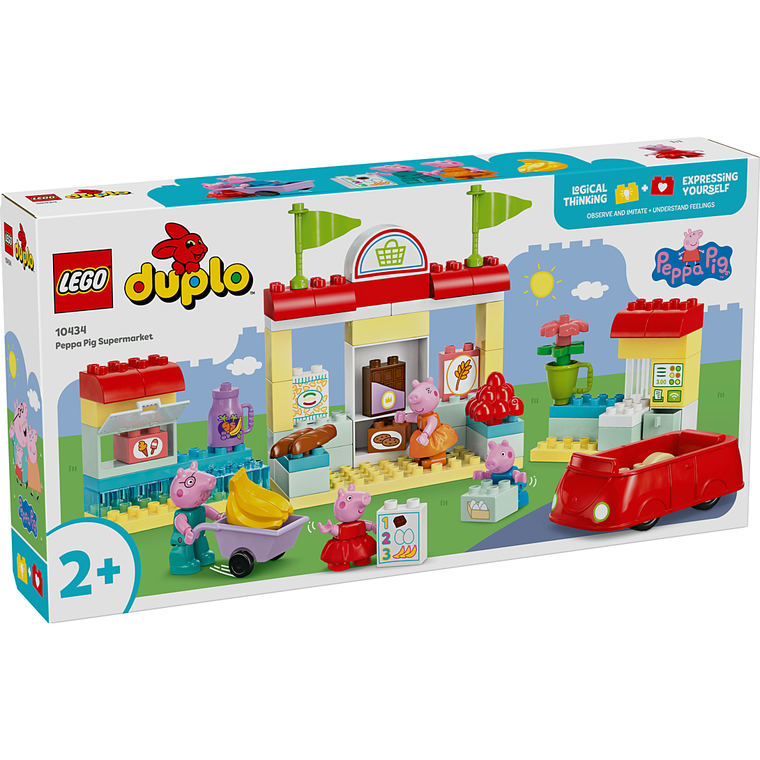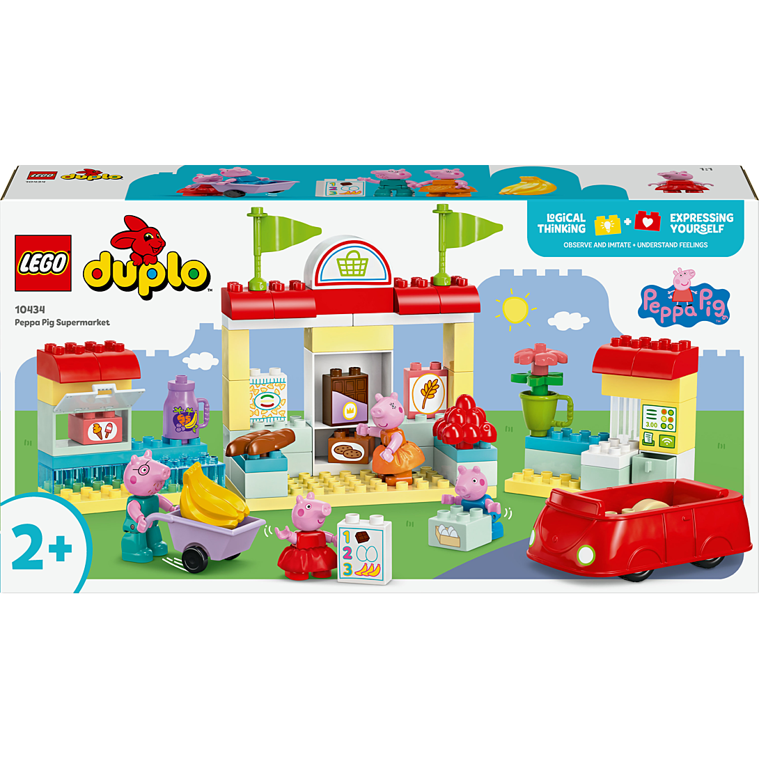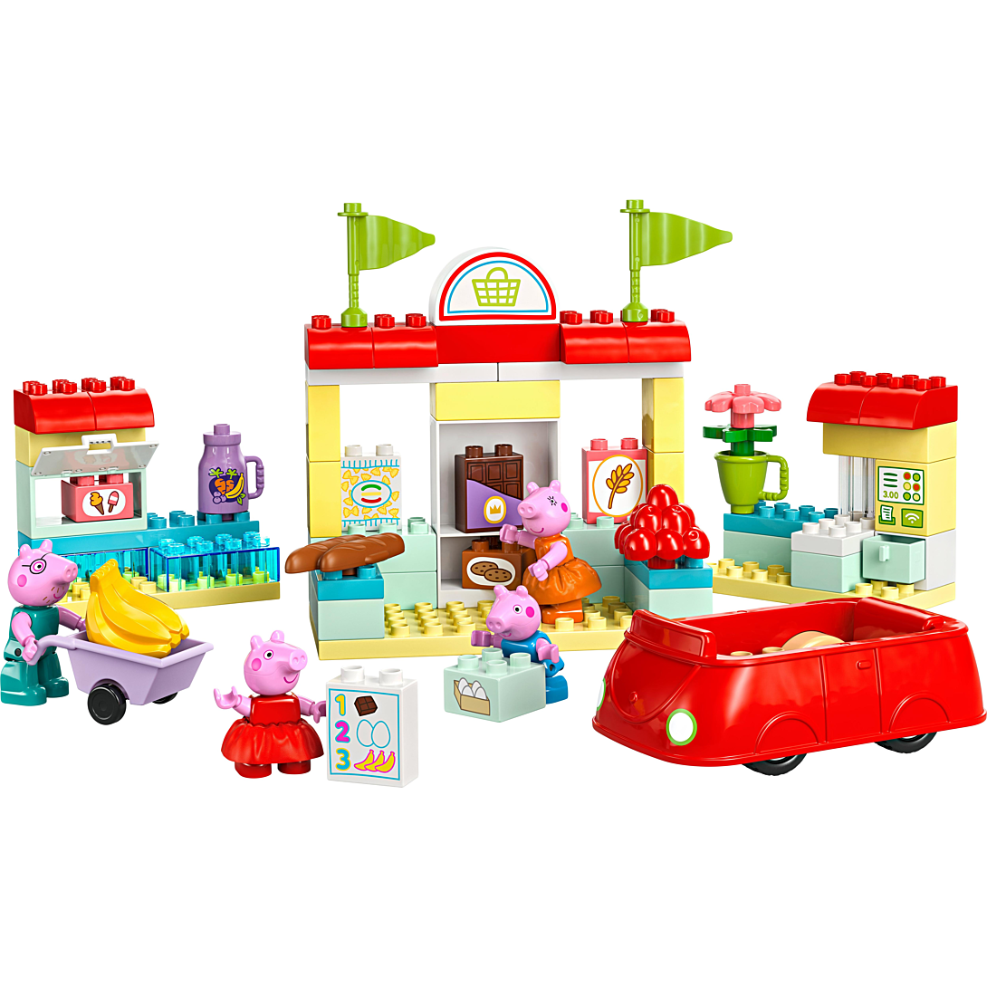 Invitez les filles et les garçons dès 2 ans à jouer à faire les courses avec Le supermarché de Peppa Pig LEGO DUPLO (10434). Les enfants partent faire des courses avec la famille à bord de la voiture rouge culte de la série. Ce jouet pour tout-petits à construire et reconstruire regorge d’accessoires qui stimulent le jeu. Avec les 4 figurines de Peppa Pig, George, Maman Pig et Papa Pig, les enfants se mettent dans la peau des parents et des enfants. Les tout-petits reconnaissent les éléments d’un vrai supermarché, comme la caisse en libre-service, le chariot et le congélateur. Avec ce jouet d’éveil LEGO DUPLO sur le thème de Peppa Pig, les enfants développent leur capacité raisonnement en rejouant des scènes de la série télévisée. Ils peuvent également explorer différentes émotions à travers le jeu. Dans ce décor, parents et enfants peuvent discuter de ce qu’il se passe lorsqu’ils sont au supermarché et surtout, décider qui pousse le chariot !