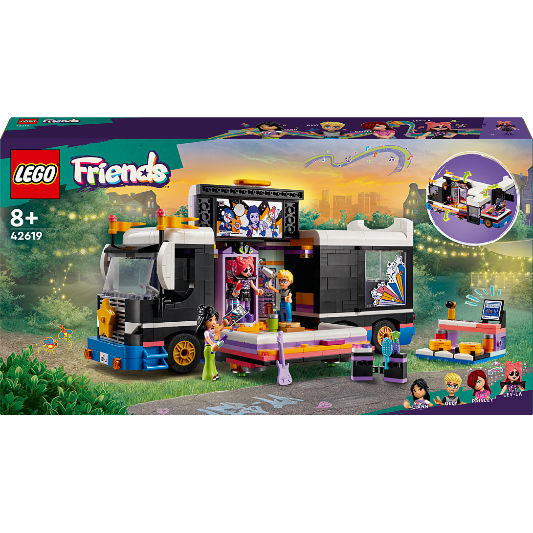 | La boîte contient | • Modèle de tourbus pour s’amuser sur le thème de la musique – Le tourbus de la star de la pop LEGO® Friends pour les filles et les garçons dès 8 ans inclut 4 mini-poupées et de nombreux accessoires• Paisley se transforme en Ley-La – Les enfants s’amusent à assembler le véhicule puis à transformer la timide Paisley en la superstar Ley-La grâce au miroir rotatif• Développement des aptitudes sociales et émotionnelles avec 4 mini-poupées et des accessoires – Le set inclut 4 personnages LEGO® Friends, dont les mini-poupées de Paisley et Ley-La qui permettent aux enfants d’opérer la métamorphose• De nombreux accessoires – Ce set LEGO® inclut de nombreux accessoires qui permettent aux enfants d’inventer des histoires d’amitiés et contribuent au développement de leurs aptitudes sociales et émotionnelles• Belle idée de cadeau sur le thème de la musique pour les fêtes – Si vous êtes à la recherche d’un cadeau pour un enfant, ce set de construction LEGO® pour les filles et les garçons passionnés de musique dès 8 ans a tout ce qu’il faut• Sets pour inventer des histoires entre amis – Découvrez les autres sets de construction LEGO Friends (vendus séparément) pour encore plus d’amusement• Dimensions – Un set de 845 pièces avec un bus à construire qui mesure plus de 12 cm de haut, 28 cm de long et 11 cm de large |