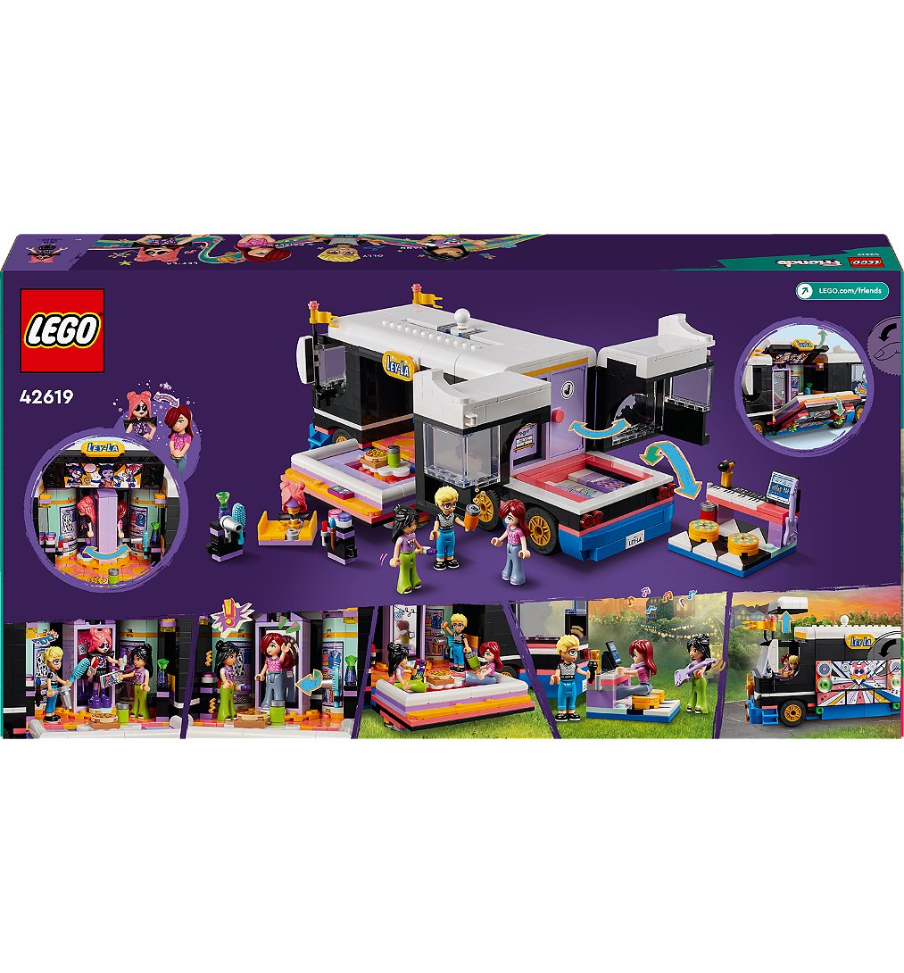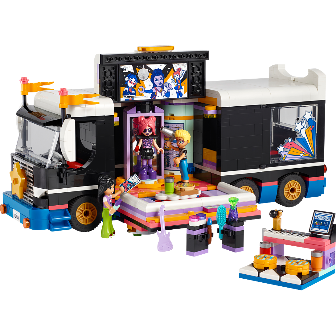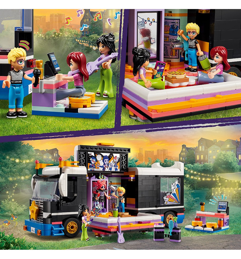 [Cet avis a été recueilli en réponse à une offre.] Le tourbus de la star de la Pop Lego pour s 'amuser sur le thème de la musique comprend ⤵️ Un bus à construire , des coulisses avec de nombreux accessoires , des autocollants et 4 personnages lego friends et une notice explicative. Les pièces se trouvent dans 8 sachets ( plus de 800 pièces) et sont numérotés pour les différentes étapes de construction. La construction du tourbus de la star pop légo est terminèe, il aura fallu 4h30 pour le construire. Un bon moment que les enfants ont apprécié, très ludique et de bonne qualitê. Il y'a même des piéces en plus. Ils ont adoré le construire avec l'application builder en 3D. Le tourbus s'ouvre devant,sur le coté et derriére pour réveler ses détails intérieurs et ses accessoires. Il se transforme en scéne pour des jeux de rôle, les enfants peuvent inventé des histoires avec les personnages. Une idée de cadeau sur la musique pour les filles et les garçons.