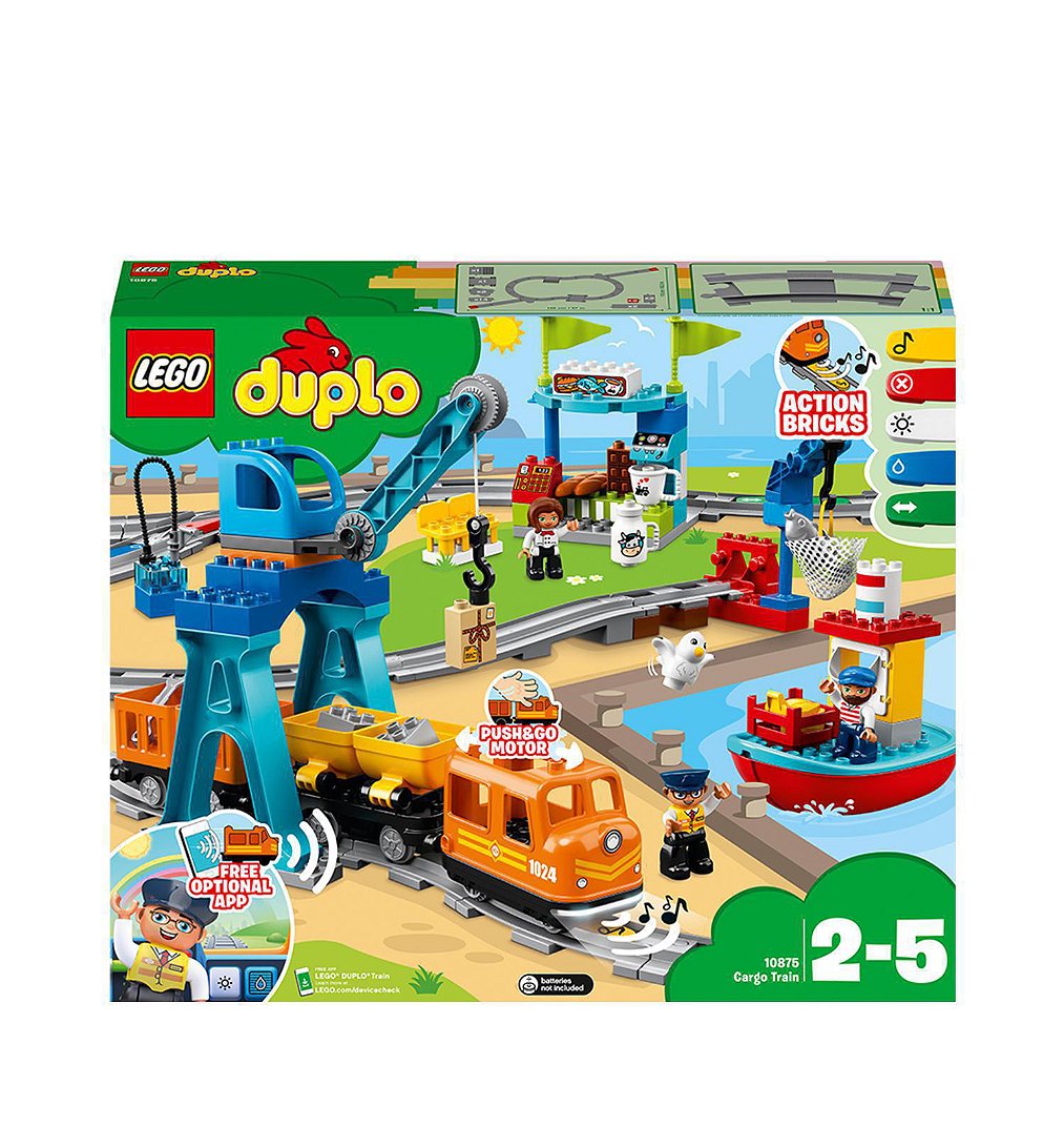 De nombreuses aventures à bord du train de marchandises LEGO® DUPLO® avec les briques d’action faciles à utiliser, le démarrage par poussée, les effets sonores et lumineux, ainsi qu’une application (optionnelle) pour jouer en ligne.Le set LEGO DUPLO Le train de marchandises est maintenant encore plus facile à contrôler pour votre enfant et simplifie l'interaction de multiples façons.Les jeunes enfants peuvent devenir les conducteurs du jouet de train grâce au moteur Push & Go - une légère poussée vers l'avant ou vers l'arrière fait avancer le train et une prise ferme ou un soulèvement des rails le stoppe. Aidez-les à placer les 5 briques d'action colorées le long de la voie pour faire sonner le klaxon, allumer et éteindre les lumières, faire une pause et faire le plein, changer la direction du train et l’arrêter où ils le souhaitent. Ce jouet de train pour enfants de 2 à 5 ans contient un port, un bateau, un café, une station de chargement, 2 grues jouets, 3 figurines DUPLO plus une figurine d'animal et de nombreuses pièces de rails incluses dans cet ensemble LEGO DUPLO, les enfants d'âge préscolaire peuvent profiter d'un jeu de train classique et amusant. Téléchargez l'application pour débloquer encore plus de possibilités de jeu, y compris la fonction de télécommande et des activités amusantes à réaliser avec votre enfant ! Ce jouet de train LEGO est un cadeau idéal pour les garçons et les filles de 2 ans et plus.Le set de train comprend un train jouet Push & Go avec lumières et sons, 2 camions de marchandises avec fonction de basculement, une zone portuaire, un café et 25 pièces de voies ferrées LEGO Comprend 5 briques d'action à code couleur, une petite grue et un bateau jouet, un grand jouet de grue, une station de chargement et comprend des interrupteurs, des collines, un passage à niveau et des arrêtsCe jouet pour les enfants de 2 à 5 ans peut être démarrer en étant poussé doucement vers l'avant ou l'arrière, et arrêté avec une main sur le haut du moteurNombre de pièces : 105 piècesÂge : 2-5