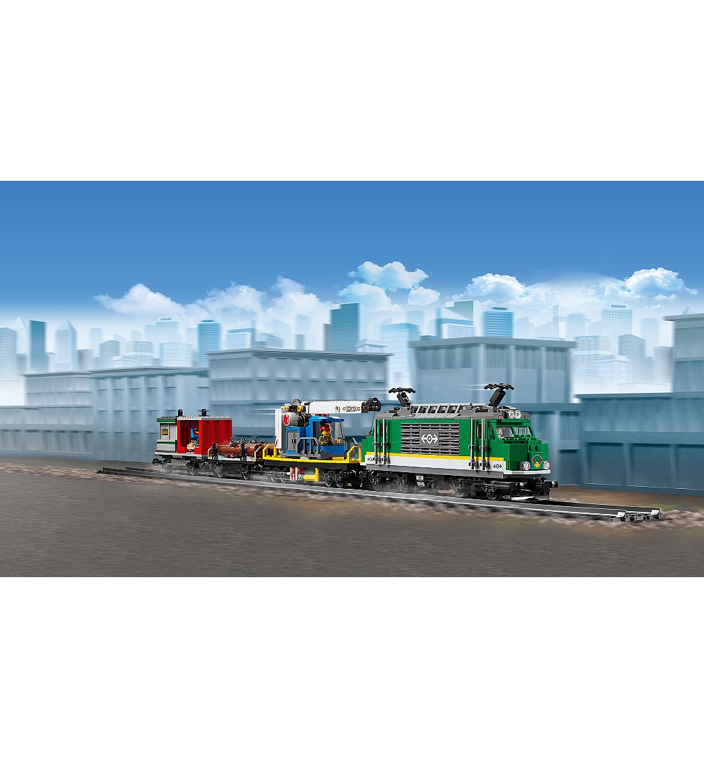 | Plus produit | Avec le train de marchandises télécommandé LEGO® City les lourdes marchandises peuvent être transportées facilement jusqu\'à leur destination ! Comprend 4 wagons, 33 pièces de circuit, un centre de contrôle, un fourgon de transport de fonds, un chariot élévateur, ainsi que 6 figurines LEGO. |