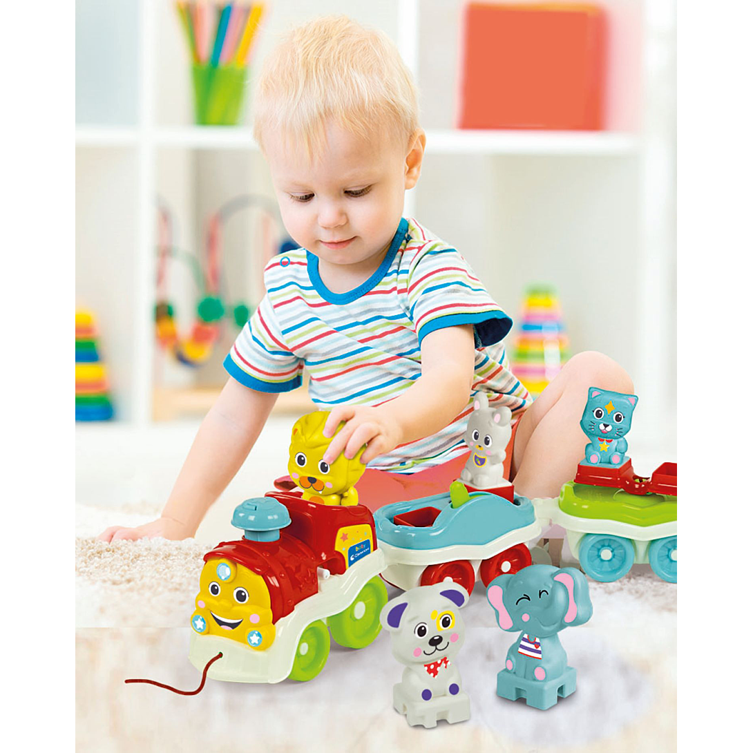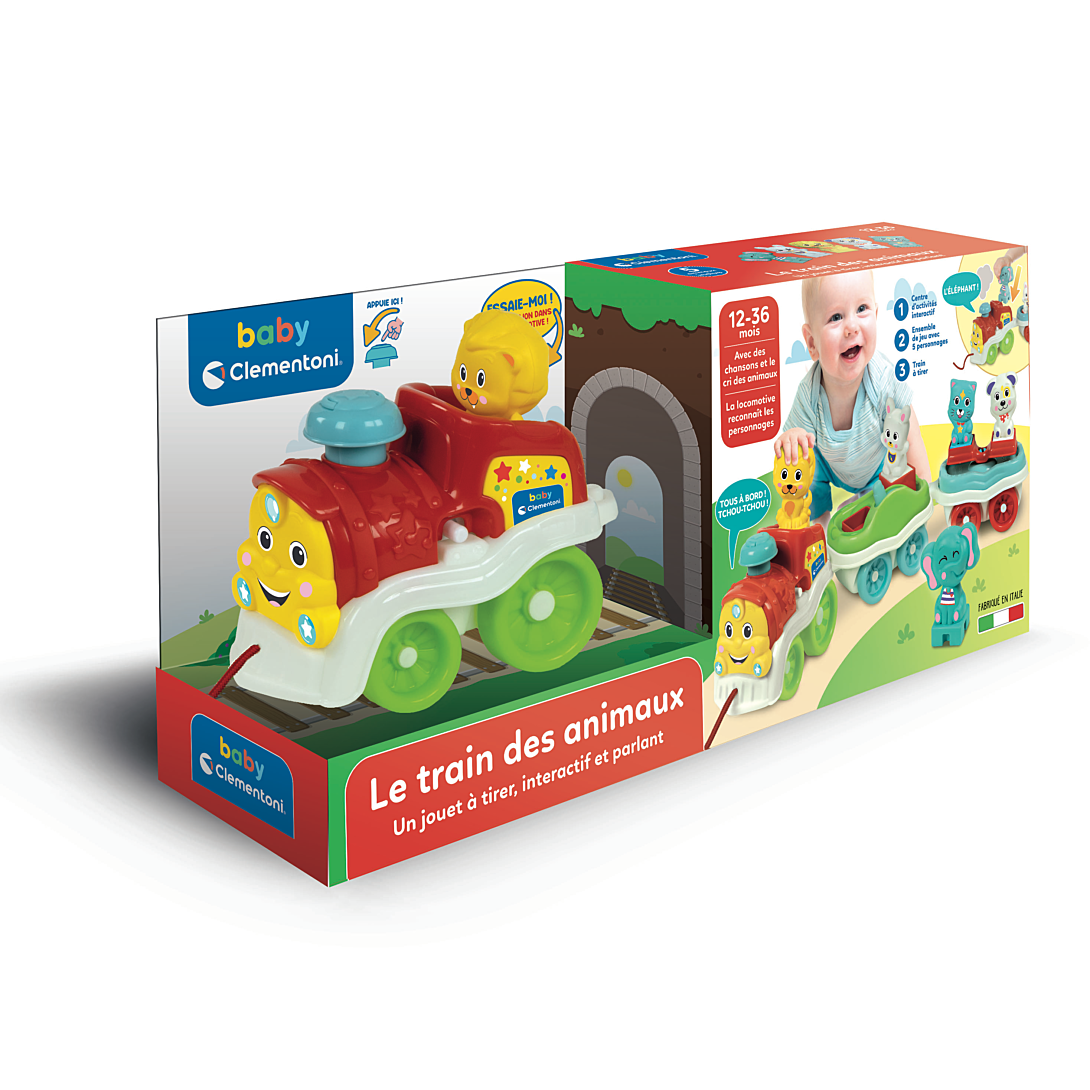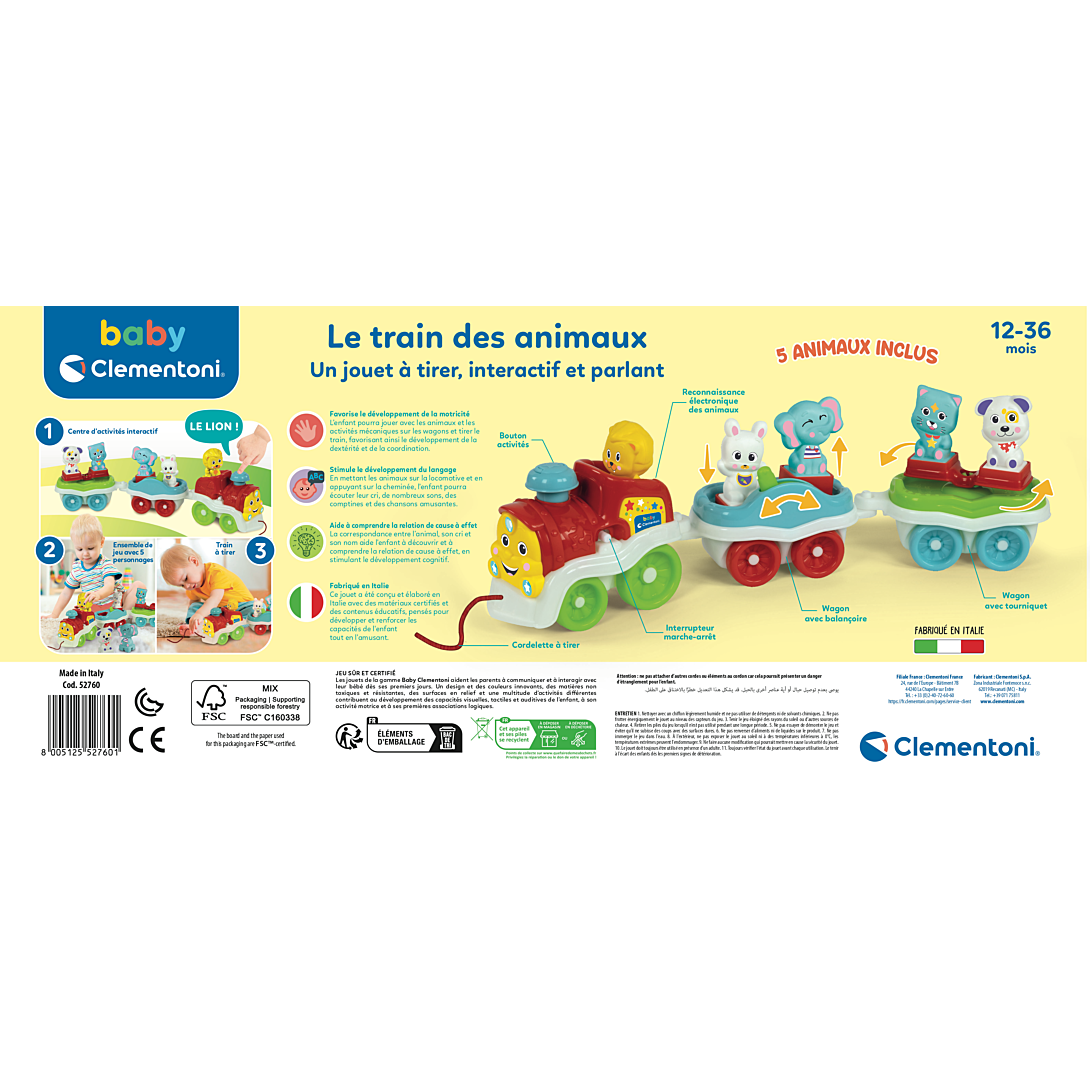 • Un petit train amusant, rempli d’activités pour divertir les plus petits tout en stimulant leur imagination. • En mettant l'un des 5 animaux sur la locomotive et en appuyant sur la cheminée, l’enfant pourra écouter des phrases, le cri des animaux, des sons et des comptines amusantes. • L'enfant pourra aussi s'amuser avec les activités mécaniques sur les wagons et tirer le train, développant ainsi sa coordination et sa motricité. • La correspondance entre l’animal, son cri et son nom aide l’enfant à comprendre la relation de cause à effet, stimulant ainsi son développement cognitif.
