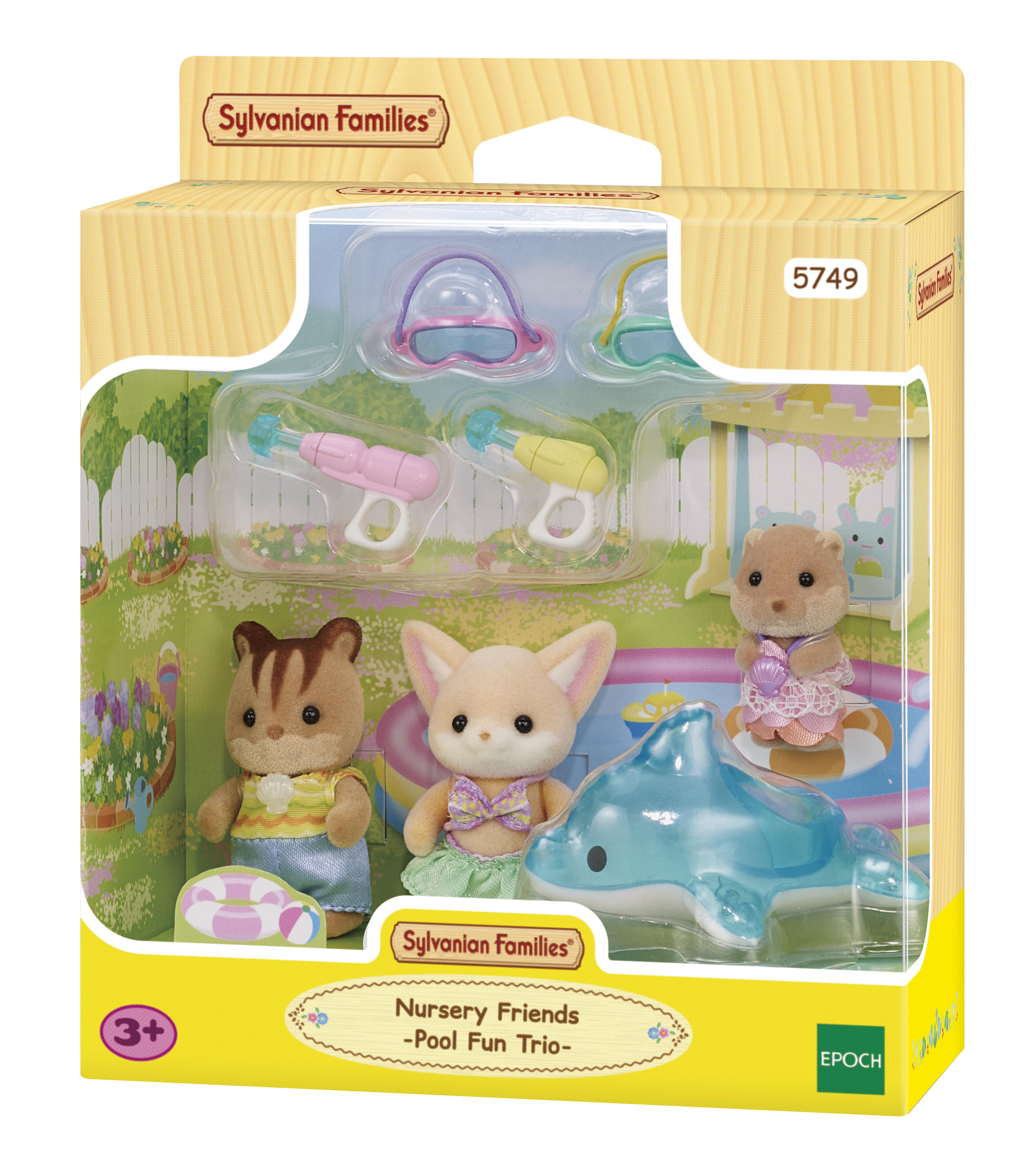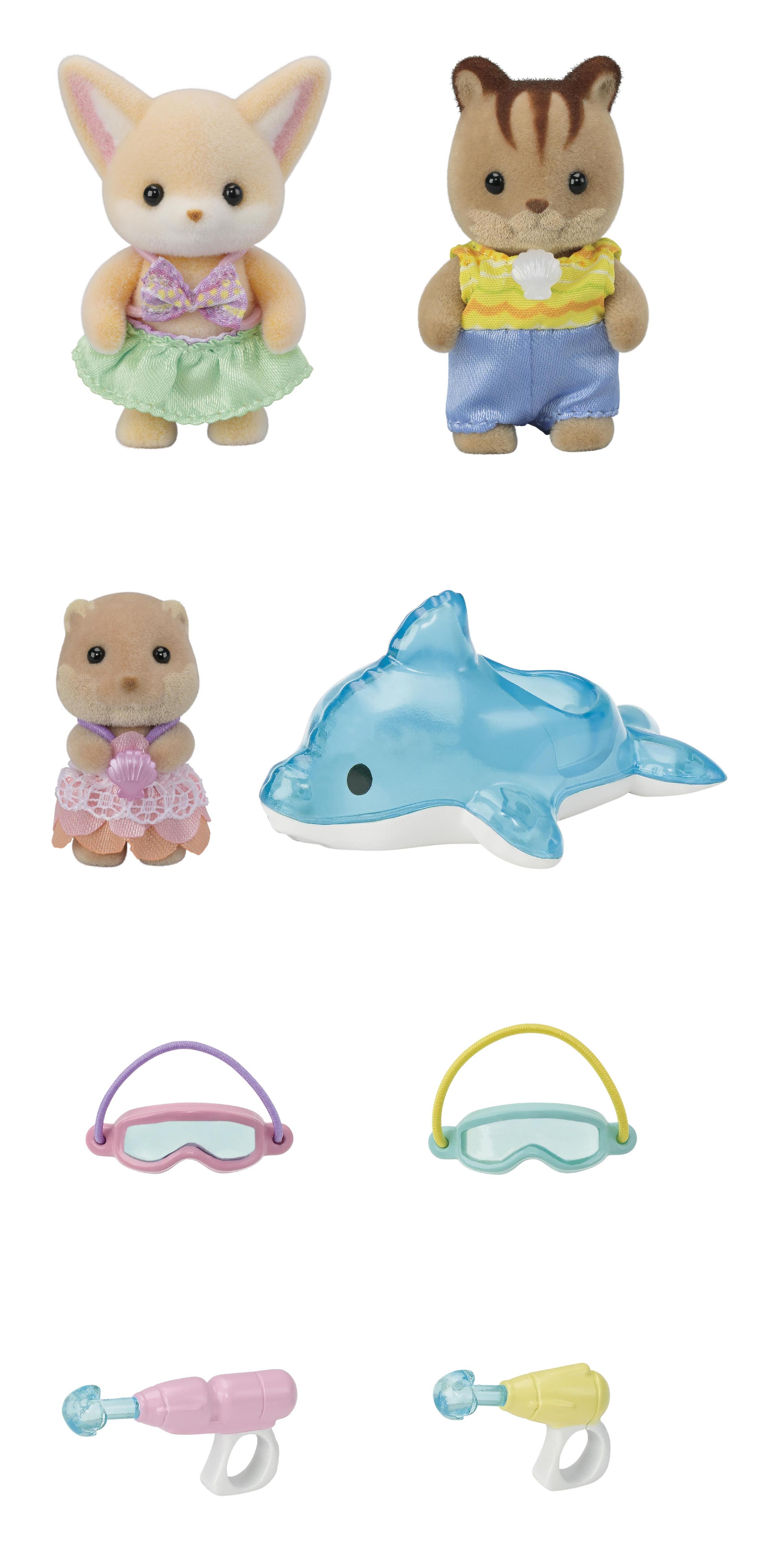 Les bébés Écureuil Roux, Fennec et Loutre partent à piscine. Pour s'amuser ensemble, ils emmènent deux pistolets à eau, deux masques de piscine et une bouée en forme de dauphin. Ils sont articulés et habillés avec soin. Leurs vêtements peuvent être enlevés et remis à loisir.
