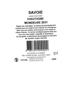 | Libellé | Le Vigneron Savoyard Terroirs, 2021 - Savoie AOP - Rouge - 75 cl |