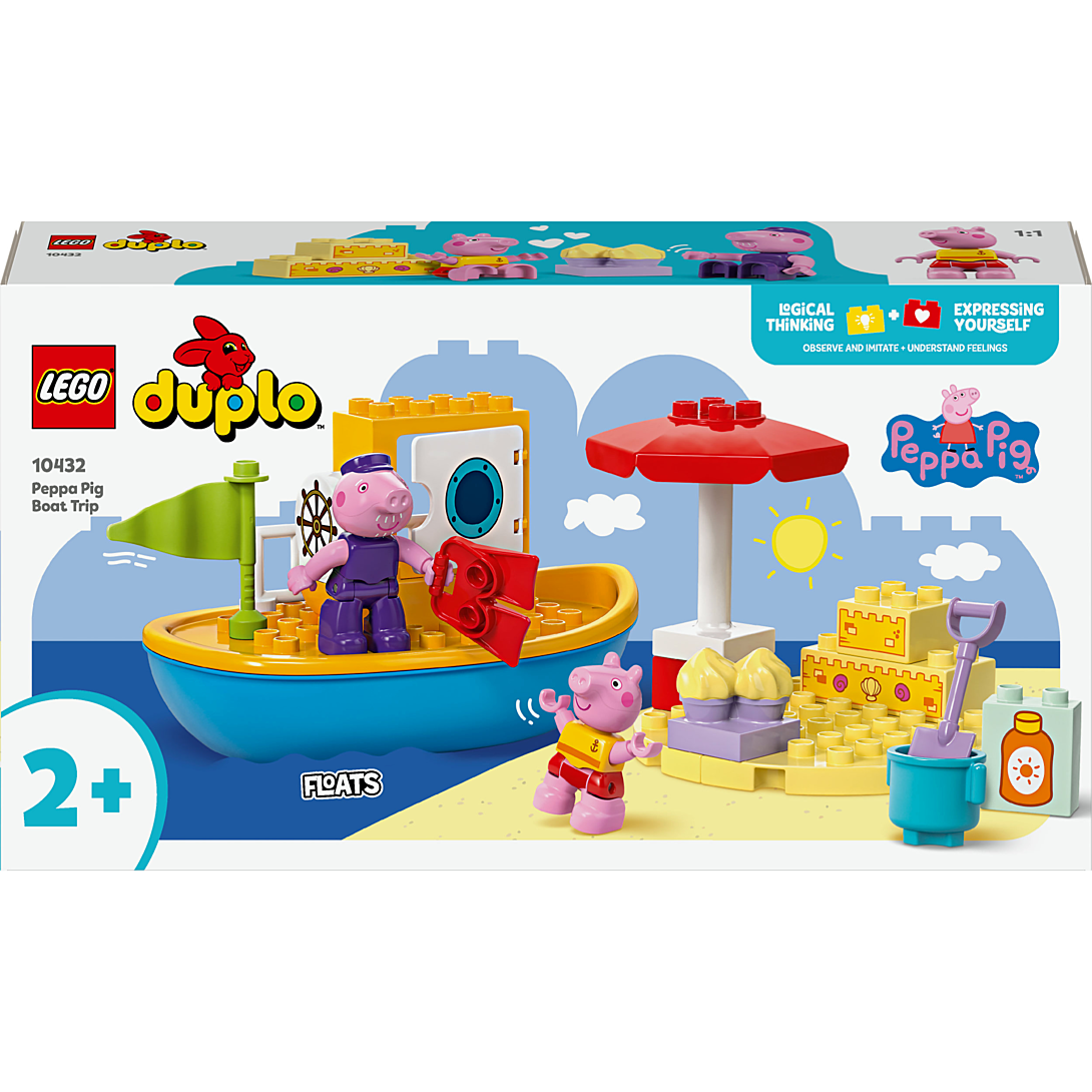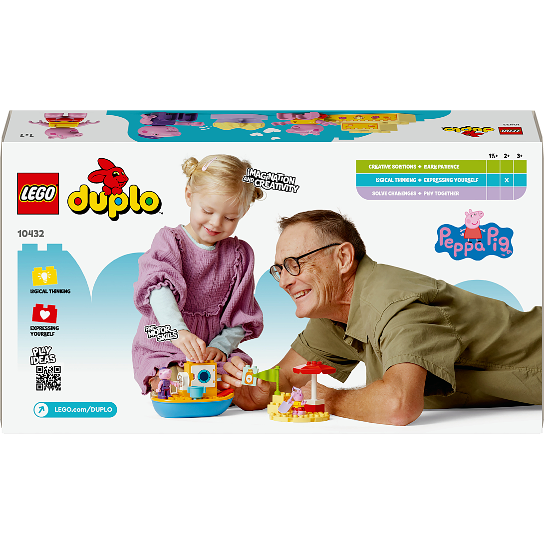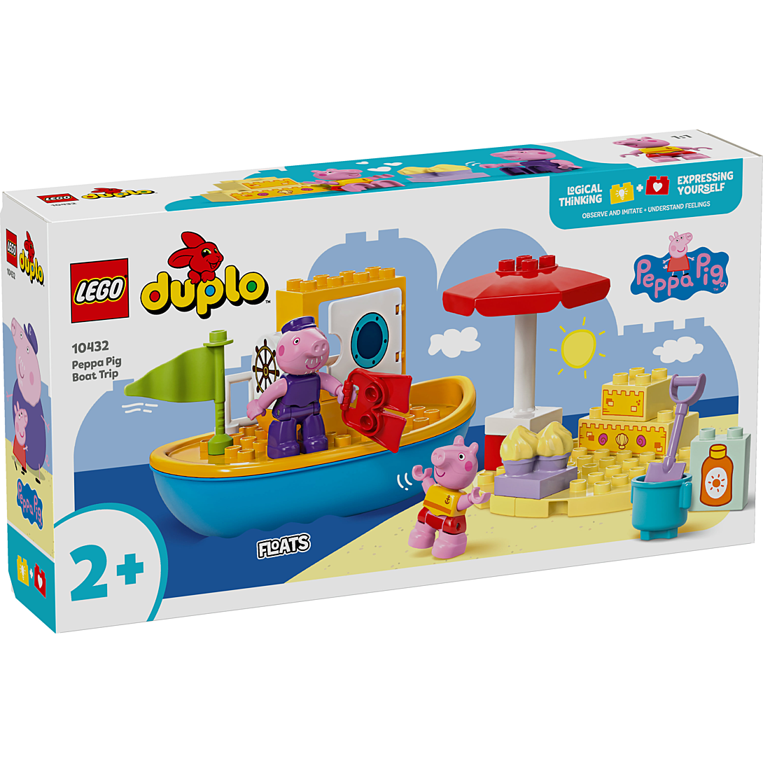 Tous à bord avec le set Le voyage en bateau de Peppa Pig LEGO® DUPLO® (10432), pour s’amuser et apprendre pendant des heures. Filles et garçons dès 2 ans se rendent à la plage avec Peppa Pig à bord du bateau de Papy Pig. Ce jouet à construire et reconstruire regorge d’accessoires créatifs qui inspirent les tout-petits. Ils aident Peppa à se mettre de la crème solaire, partent chercher des coquillages et perfectionnent leurs talents de constructeurs avec le château de sable. S’il fait trop chaud, Peppa peut se réfugier sous le parasol ou aller nager. Les enfants améliorent leur coordination œil-main et leur motricité fine en aidant leur héroïne à mettre ses palmes. Ils peuvent aussi se rafraîchir en se mettant à l’eau avec le bateau de Papy Pig, car il flotte vraiment. Les jouets LEGO DUPLO Peppa Pig favorisent les apprentissages des tout-petits. Ils les aident à penser de manière logique et à exprimer leur créativité en développant une histoire et en rejouant des scènes de la série TV.
