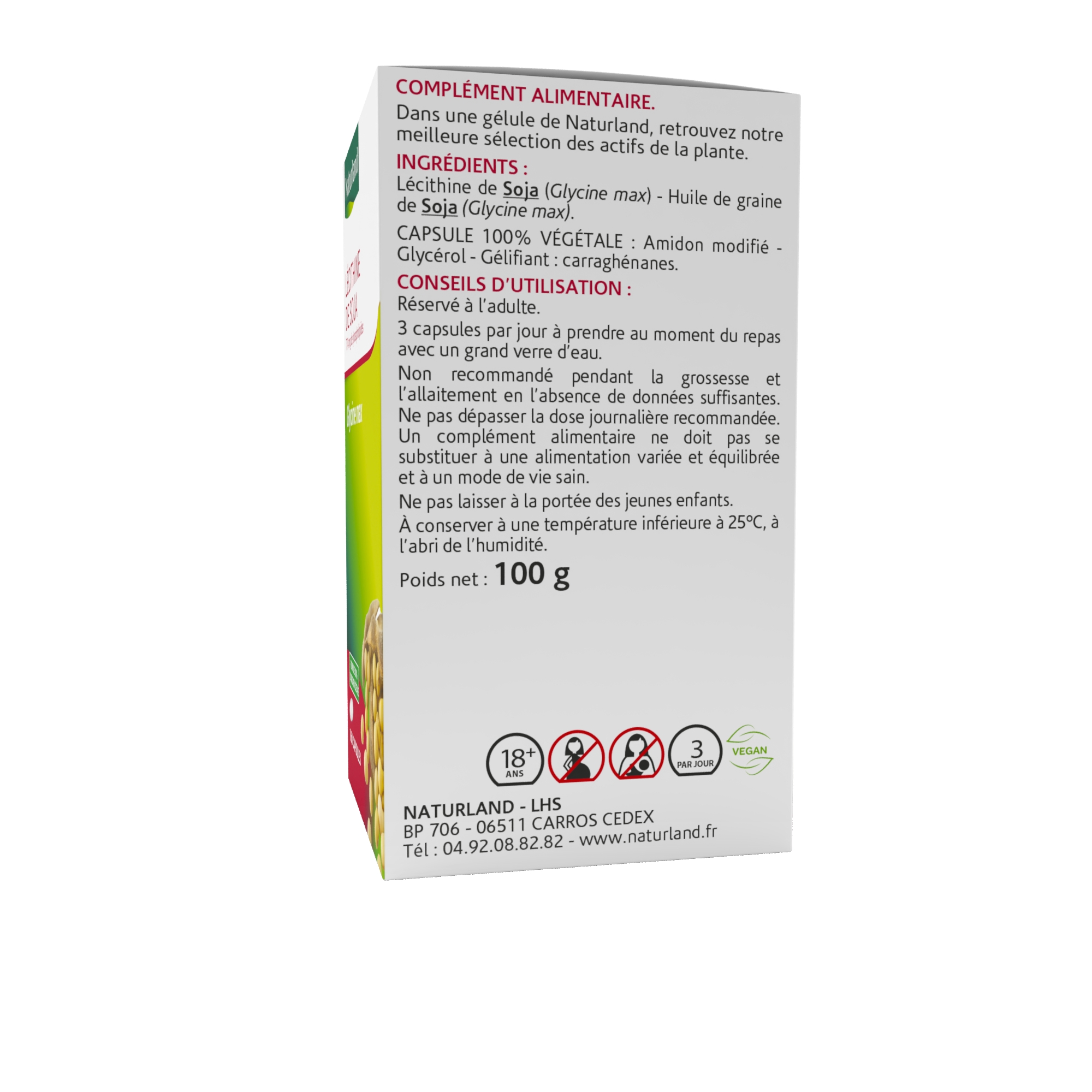 Soja (Glycine max). Capsule 100% végétale : Amidon modifié - Glycérol – Gélifiant : carraghénanes.