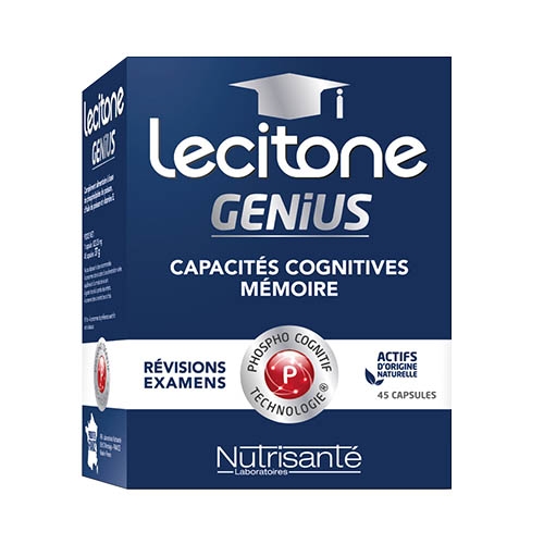 Lecitone Genius améliore les fonctions cognitives : mémoire, concentration, apprentissage en période de preparation d'examens : brevet des colleges, bac, concours, etc. Poids net: 37g Complément alimentaite Laboratoires Nutrisanté Parc d'activité Sud Loire BP1213 85612 Montaigu Cedex