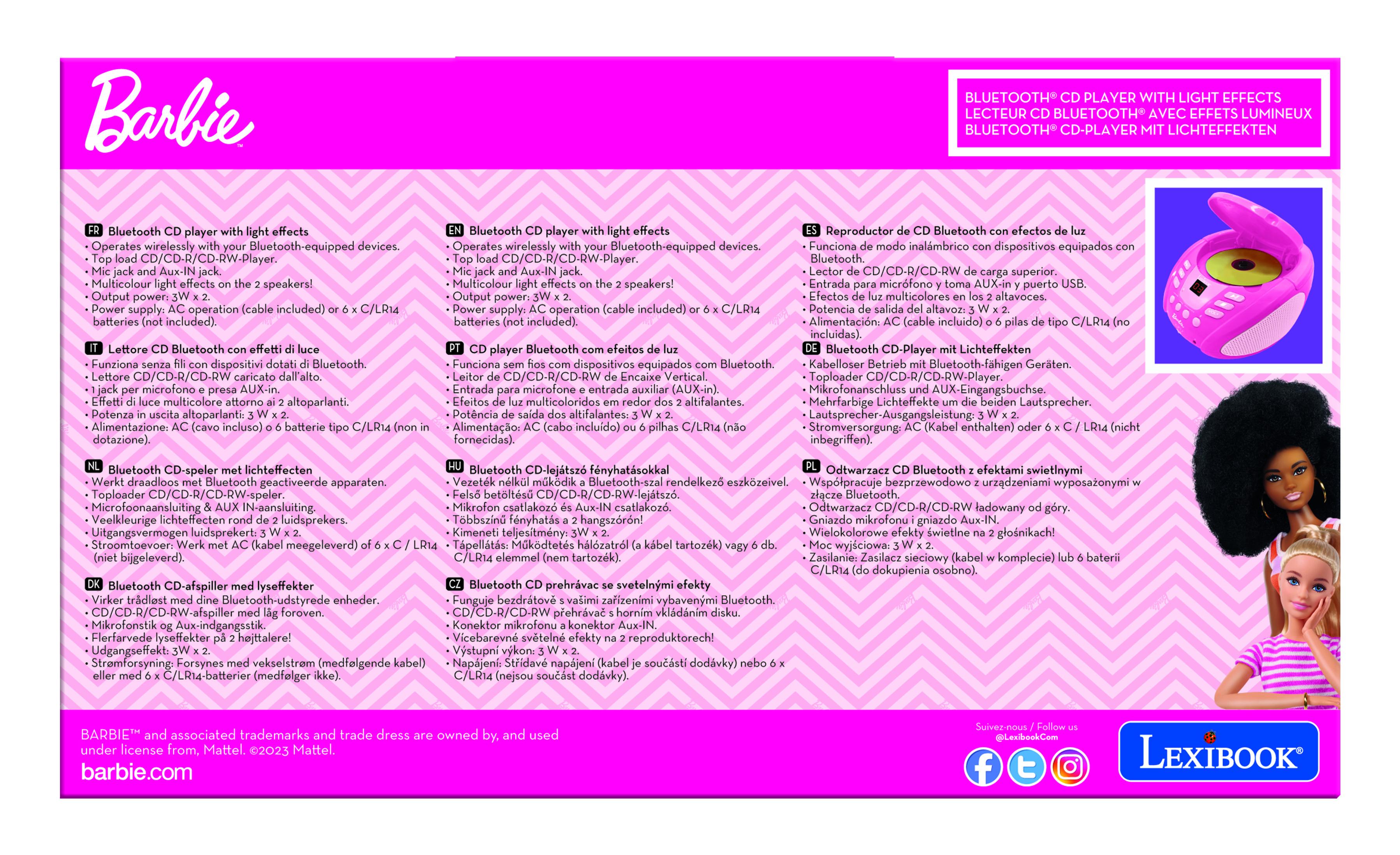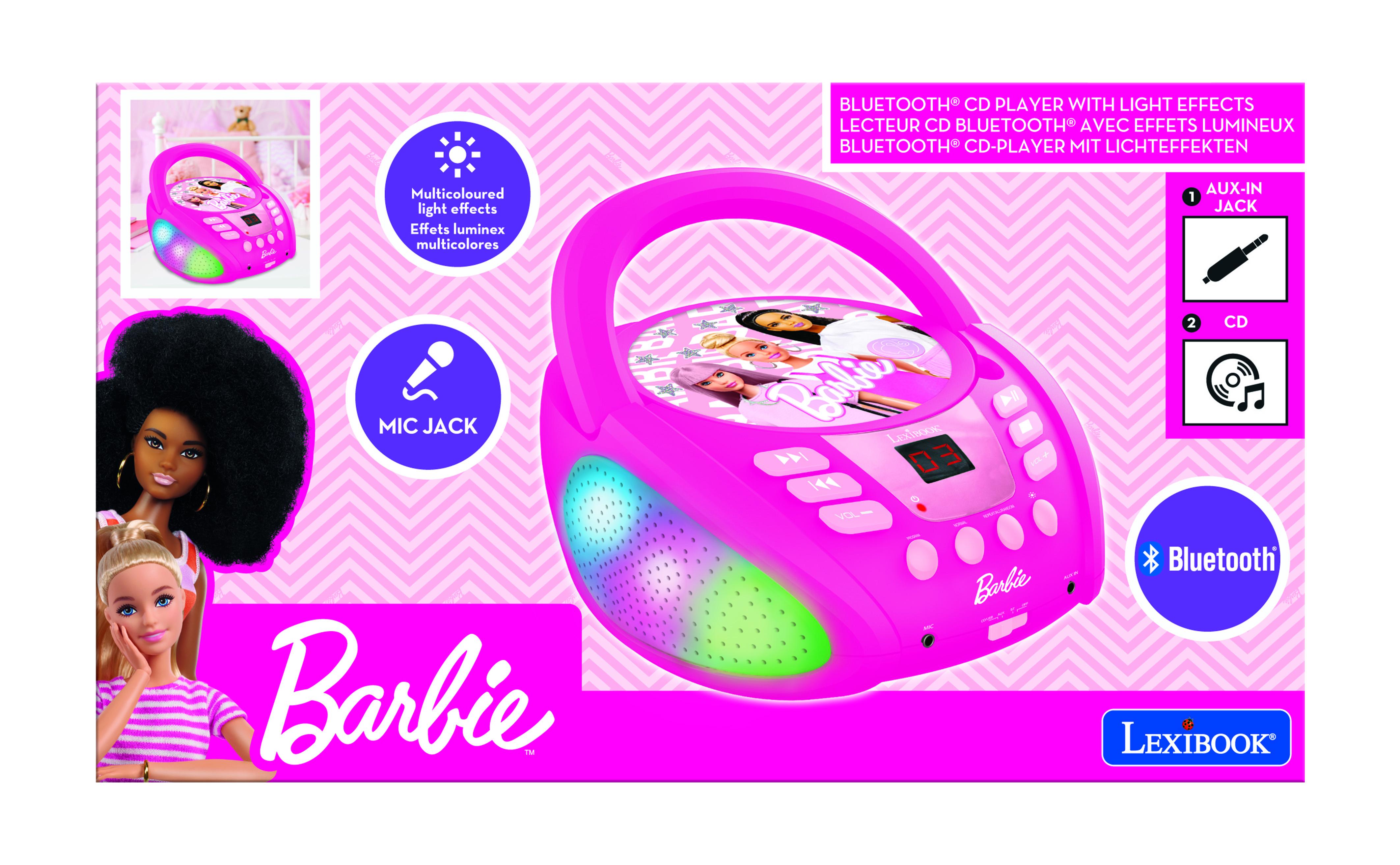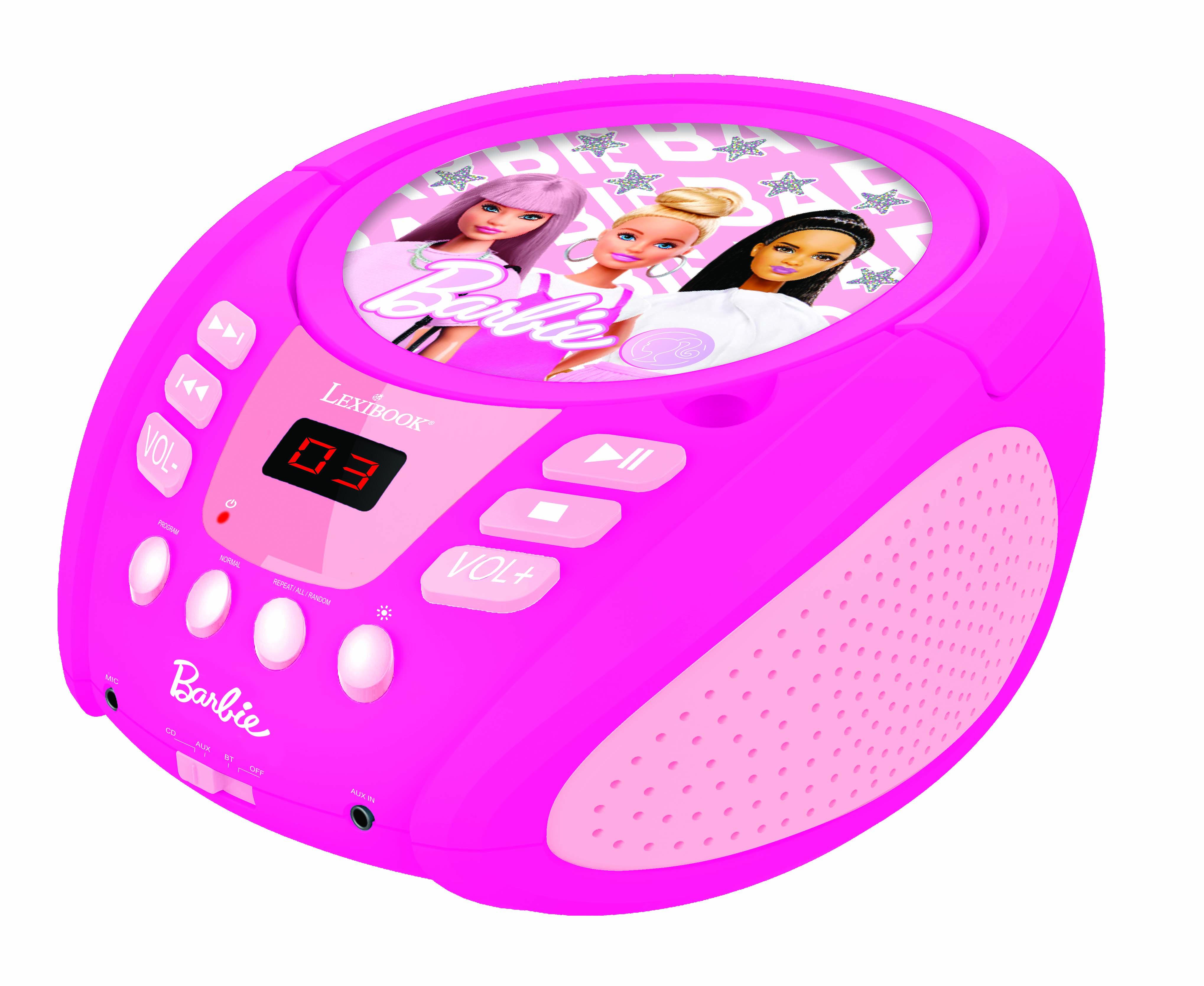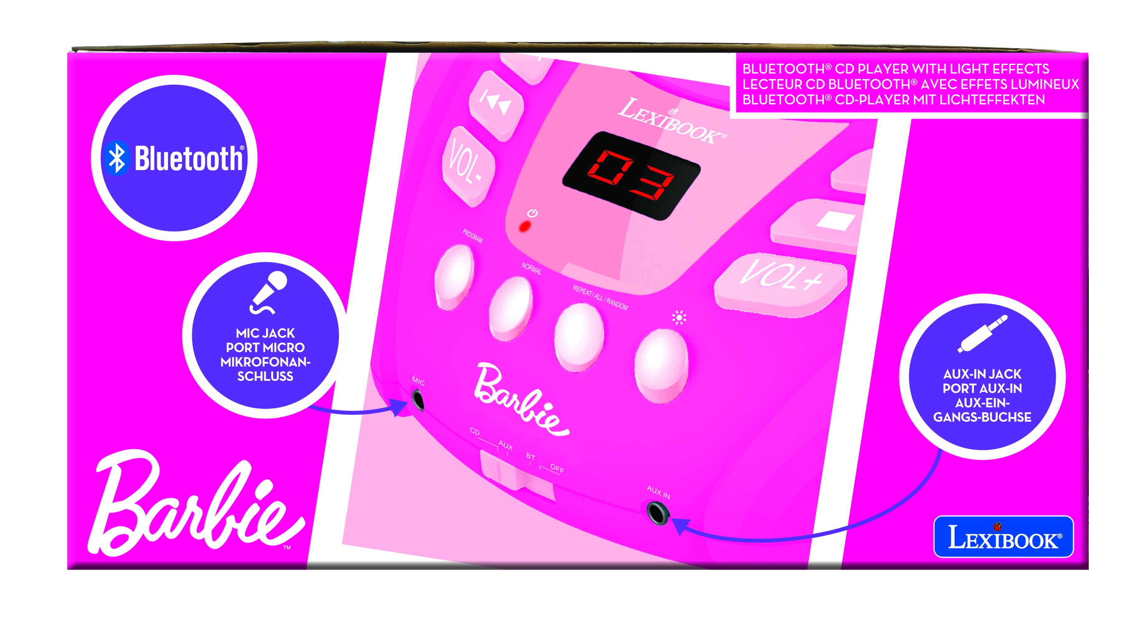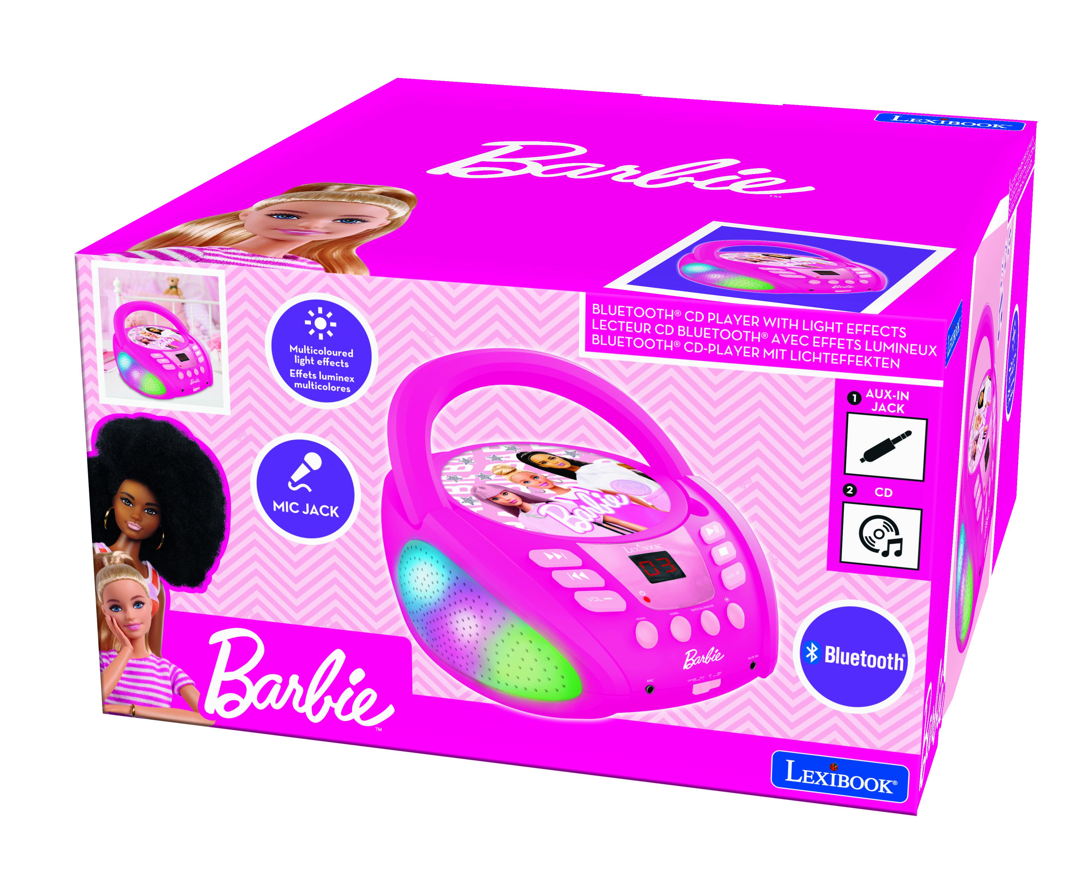 � Le lecteur CD parfait pour les enfants, avec un joli design Barbie et des effets lumineux multicolores ! � Le Bluetooth 5.0 permet de se connecter sans fil � vos smartphones, tablettes et autres appareils Bluetooth ! � Compatible avec les CD / CD-R / CD-RW. � Prise d'entr�e auxiliaire pour connecter une tablette ou un smartphone avec prise audio. � Prise micro 3,5 mm pour brancher un micro et chanter comme une star ! � Design robuste et poign�e pour le transporter partout.