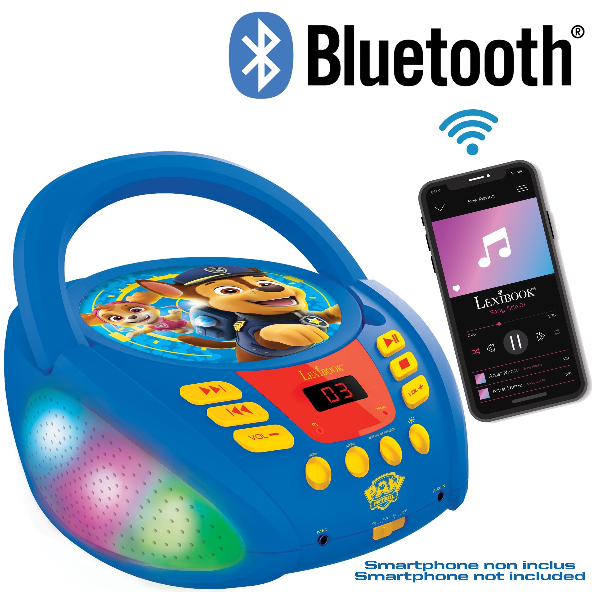 * Le lecteur CD (CD/CD-R/CD-RW) transportable Paw Patrol : Pat' Patrouille avec de nouveaux effets de lumi�re multicolores, parfait pour les enfants ! * Bluetooth 5.0, se connecte sans fil aux smartphones, tablettes et autres appareils Bluetooth ! * Prise microphone (micro non inclus) pour le transformer en karaok� et chanter avec les h�ros de la Pat' Patrouille, Chase et Stella ! * Entr�e audio auxiliaire pour tablettes et smartphones. * Fonction ��programmation/r�p�tition�� int�gr�e. * Enceintes : 3 W x 2. * Alimentation : prise secteur (c�ble inclus) ou 6 piles C/LR14 (non incluses).