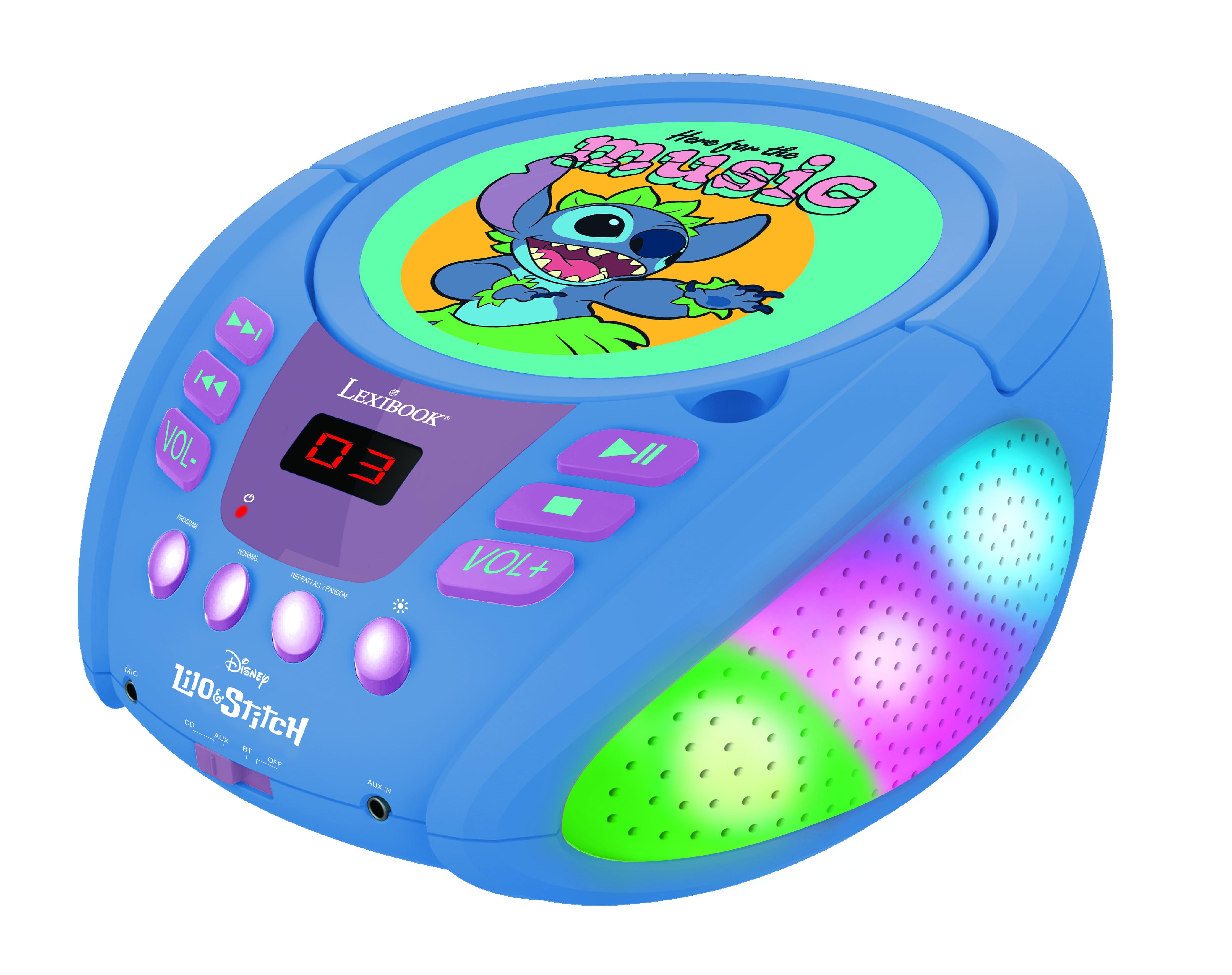 Magnifique Lecteur CD Bluetooth avec effets lumineux Stitch • Le lecteur CD parfait pour les enfants, avec Stitch et des effets de lumière multicolores! • Bluetooth 5.0, se connecte sans fil avec vos smartphones, tablettes et autres appareils Bluetooth! • Compatible avec les CD / CD-R / CD-RW. • Prise d'entrée auxiliaire pour connecter une tablette ou un smartphone avec prise audio. • Prise micro 3,5 mm pour brancher un micro et chanter comme une star! • Puissance de sortie: 3 W x 2. • Conception robuste et poignée pour l'emporter partout!