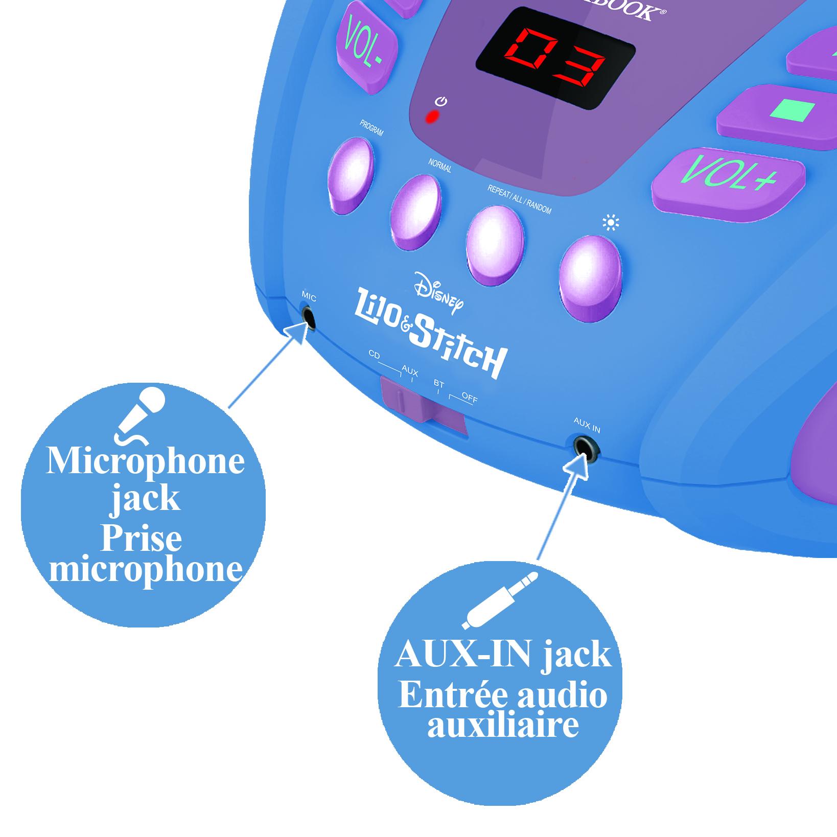 Magnifique Lecteur CD Bluetooth avec effets lumineux Stitch • Le lecteur CD parfait pour les enfants, avec Stitch et des effets de lumière multicolores! • Bluetooth 5.0, se connecte sans fil avec vos smartphones, tablettes et autres appareils Bluetooth! • Compatible avec les CD / CD-R / CD-RW. • Prise d'entrée auxiliaire pour connecter une tablette ou un smartphone avec prise audio. • Prise micro 3,5 mm pour brancher un micro et chanter comme une star! • Puissance de sortie: 3 W x 2. • Conception robuste et poignée pour l'emporter partout!