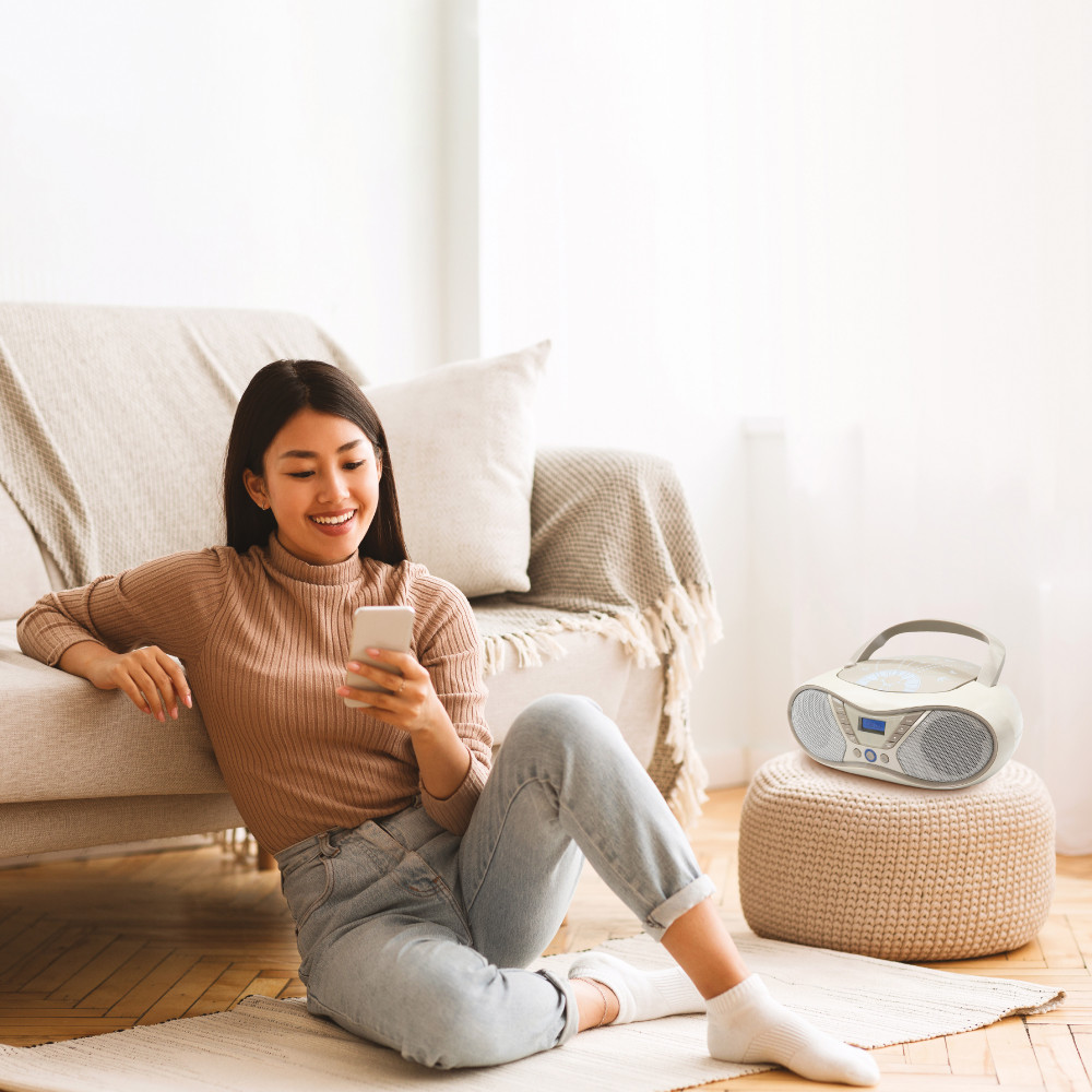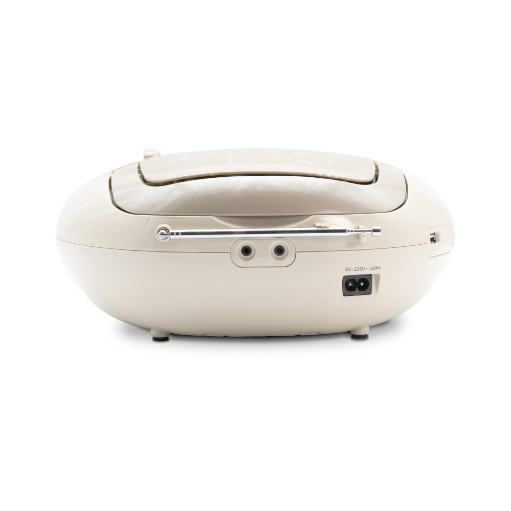 Appréciez les nombreuses fonctionnalités de ce lecteur CD Soft Grey : écoutez vos CD, CD-R, CD-RW, CD-MP3 mais aussi la radio FM et les musiques préférées stockées sur votre clé USB. Appréciez son son stéréo d'une puissance totale de 6 W. Vous pouvez également brancher votre casque pour profiter de votre musique en toute tranquillité. Avec sa poignée de transport et sa forme ergonomique, vous pouvez facilement le transporter pour l'écouter dans toutes les pièces de votre maison. Pratique, il fonctionne sur secteur ou à piles (non fournies).