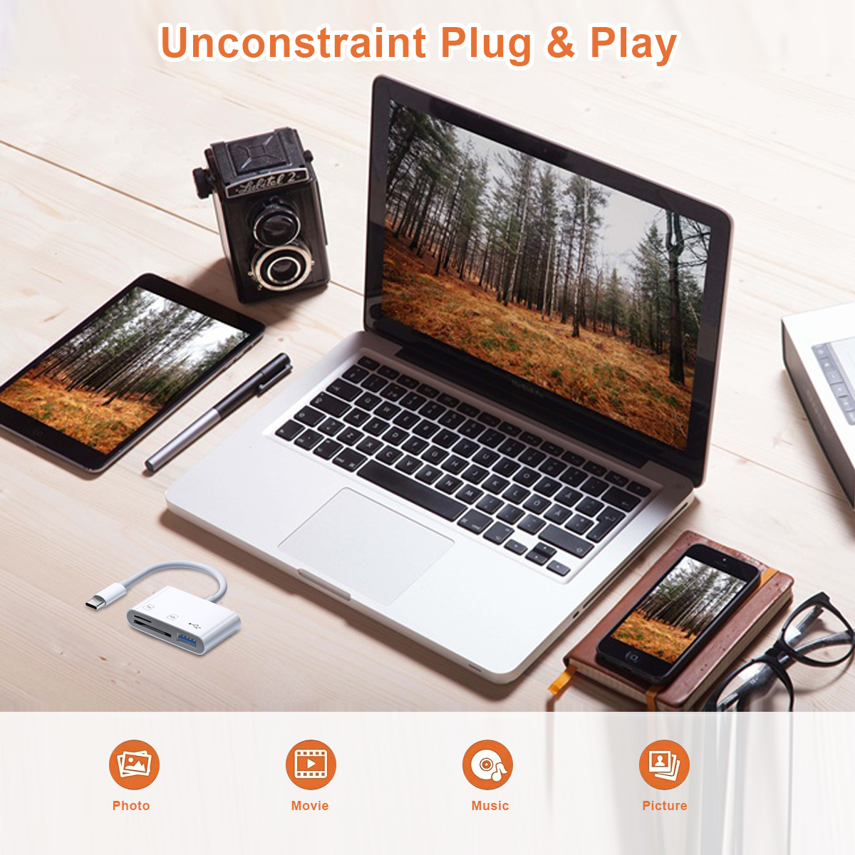 Lecteur de cartes 3 en 1, USB-C vers SD/TF/USB
