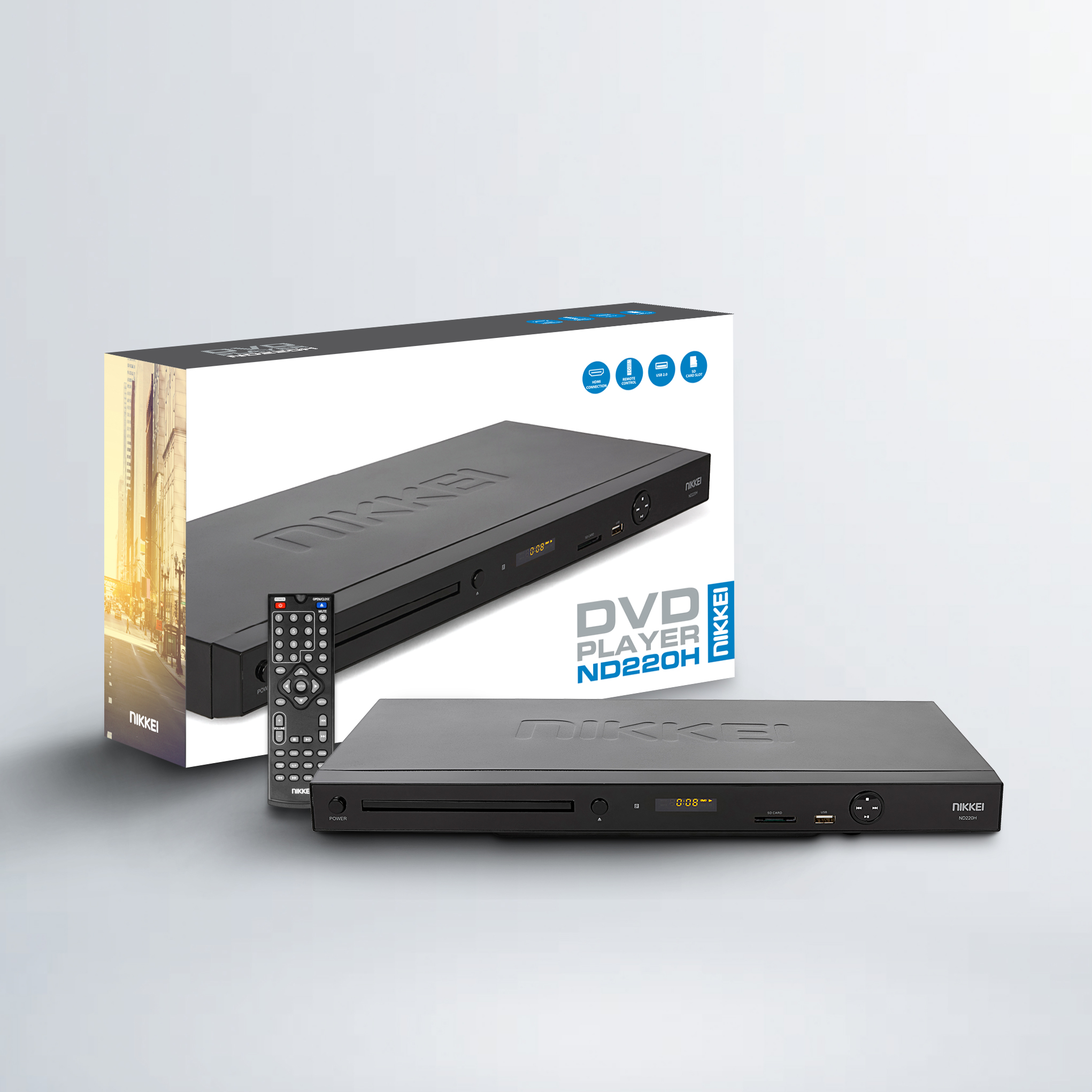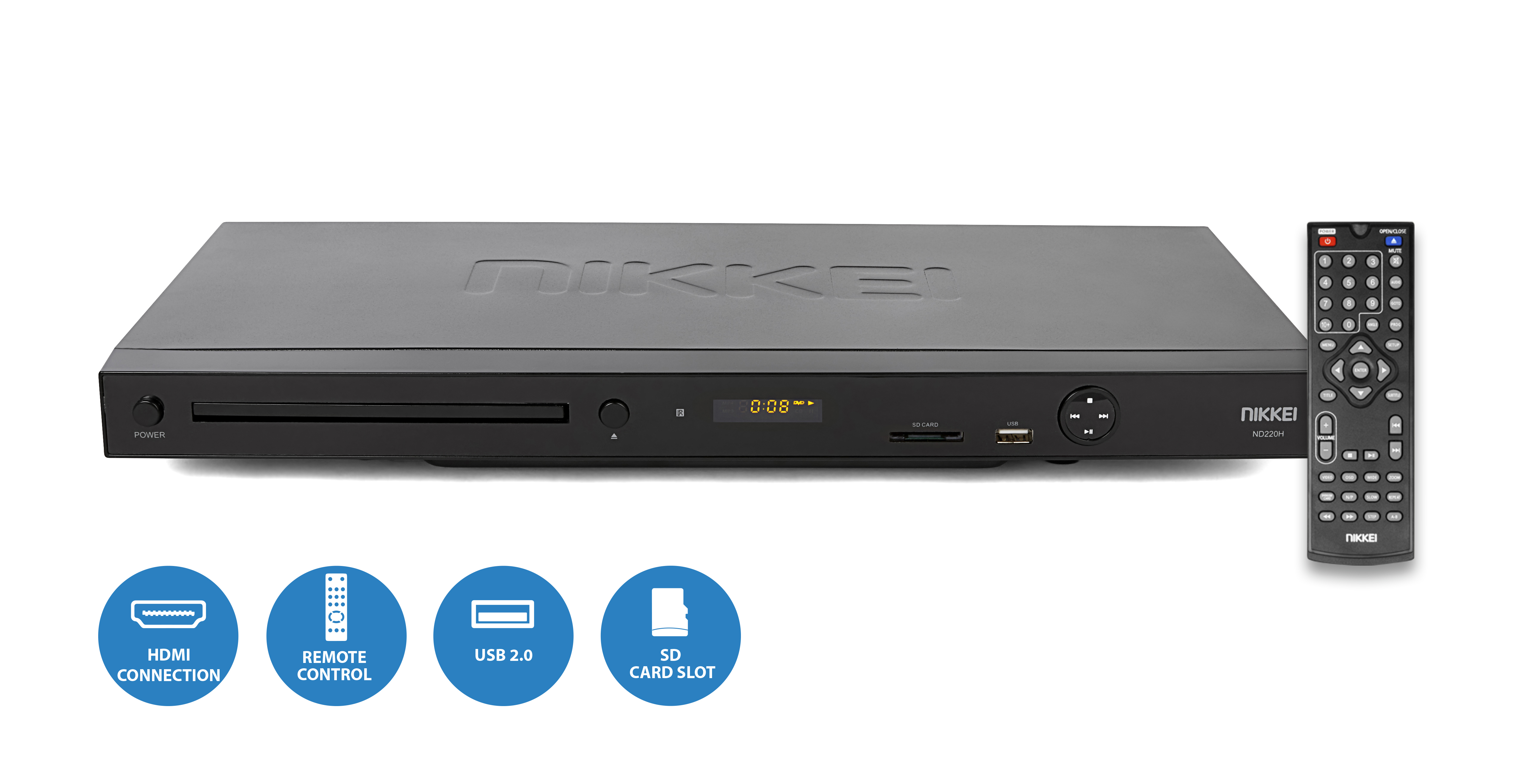 Le Nikkei ND220H est un lecteur DVD avec une connexion HDMI et péritel et un lecteur de carte.