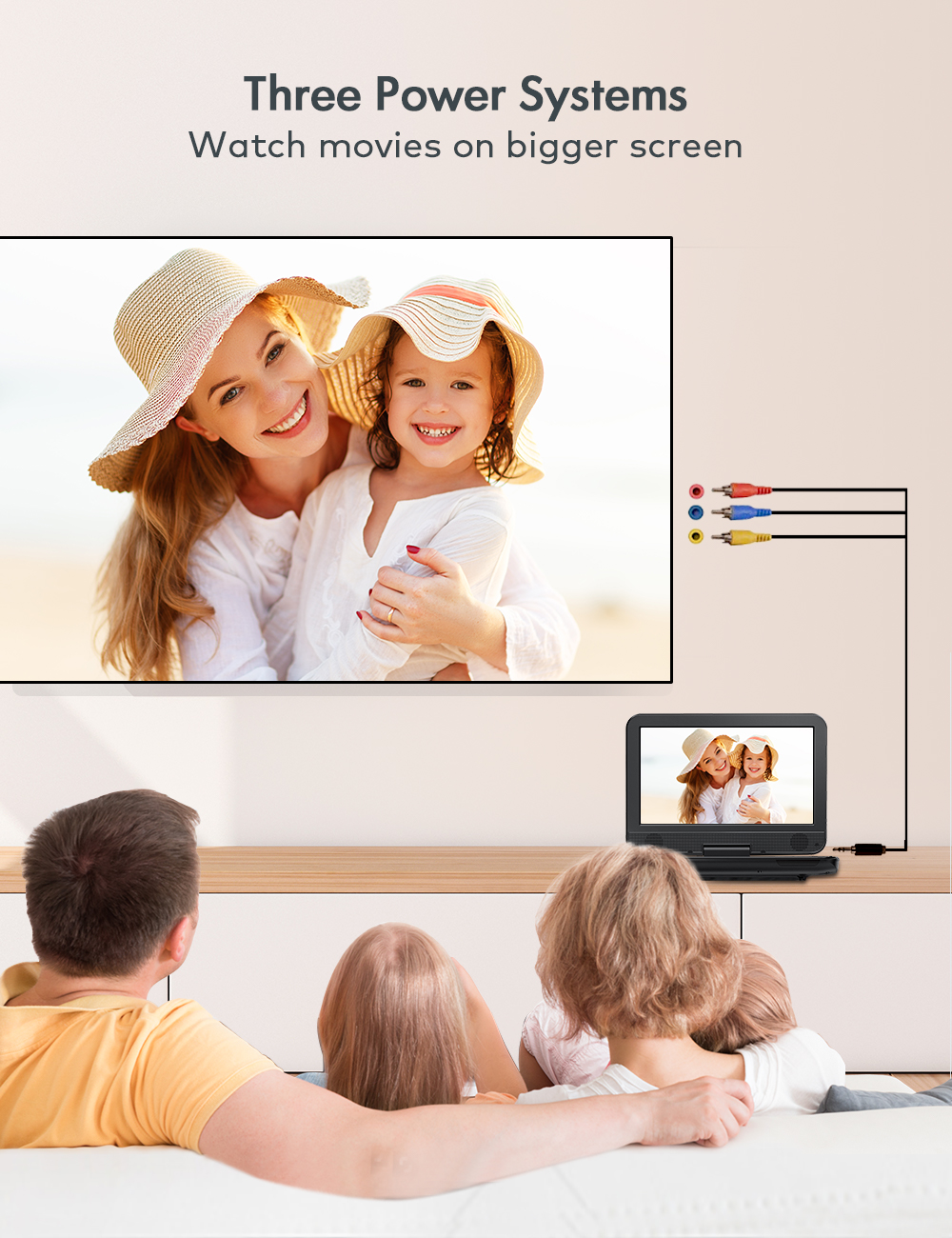 La beauté de ce lecteur DVD est que vous pouvez le connecter à votre téléviseur et lire des films sur un écran plus grand à la maison. Connectez simplement le lecteur DVD au téléviseur avec le câble AV 3 en 1, cela permet une connexion grand écran où toute la famille peut profiter du film ensemble.