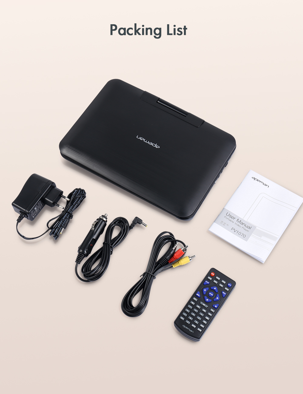 Synchronisation facile de l'écran avec la télévision - La prise AV IN/OUT permet de synchroniser l'écran avec la télévision, le projecteur ou un autre lecteur DVD. Profitez de films de qualité cinéma à un prix abordable. APEMAN offre un an d'assistance technique gratuite.