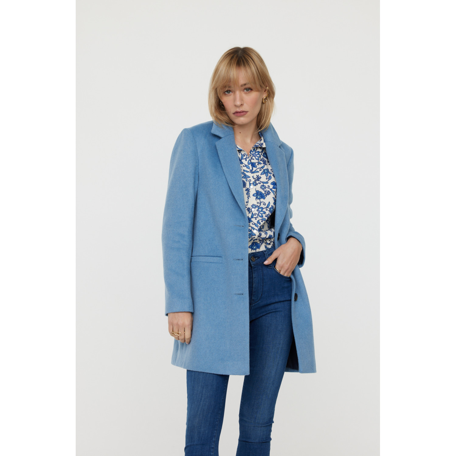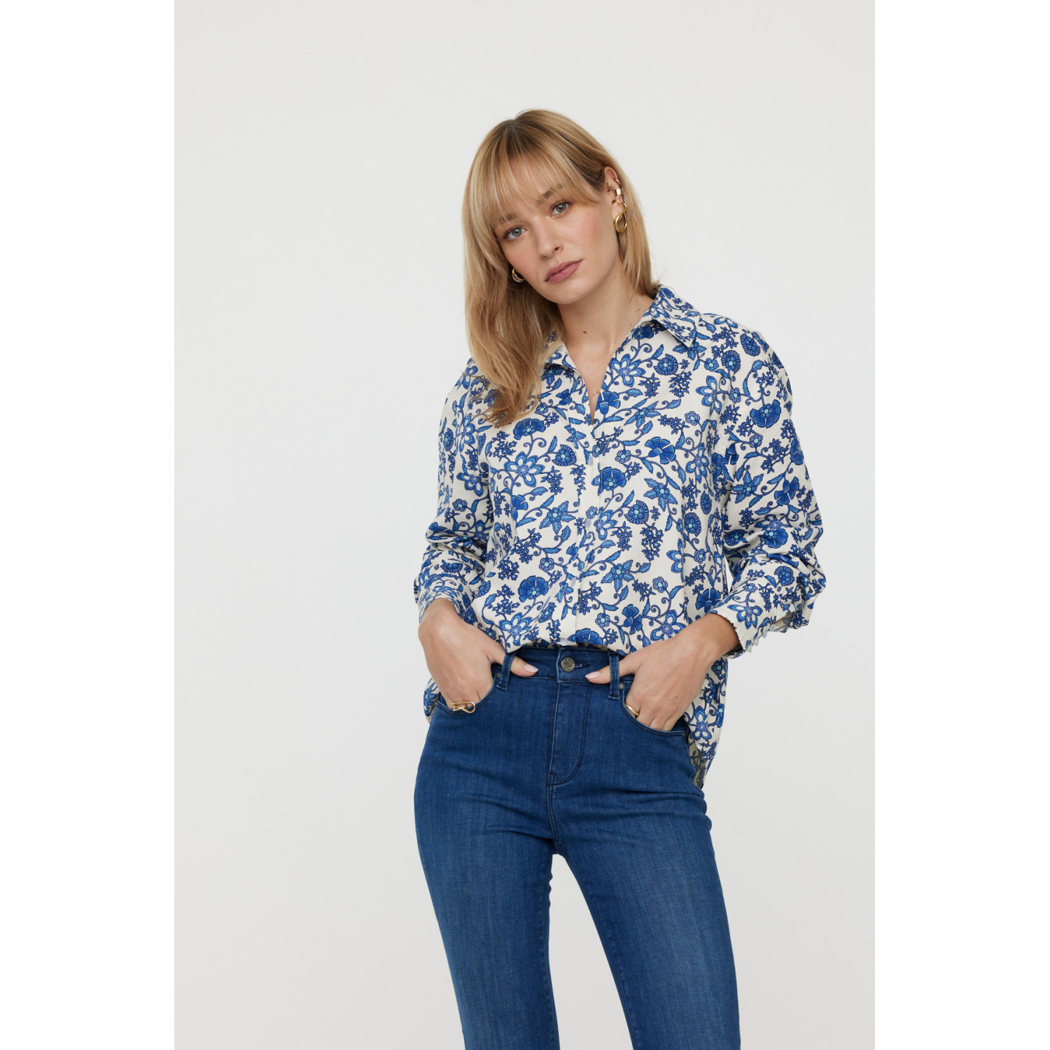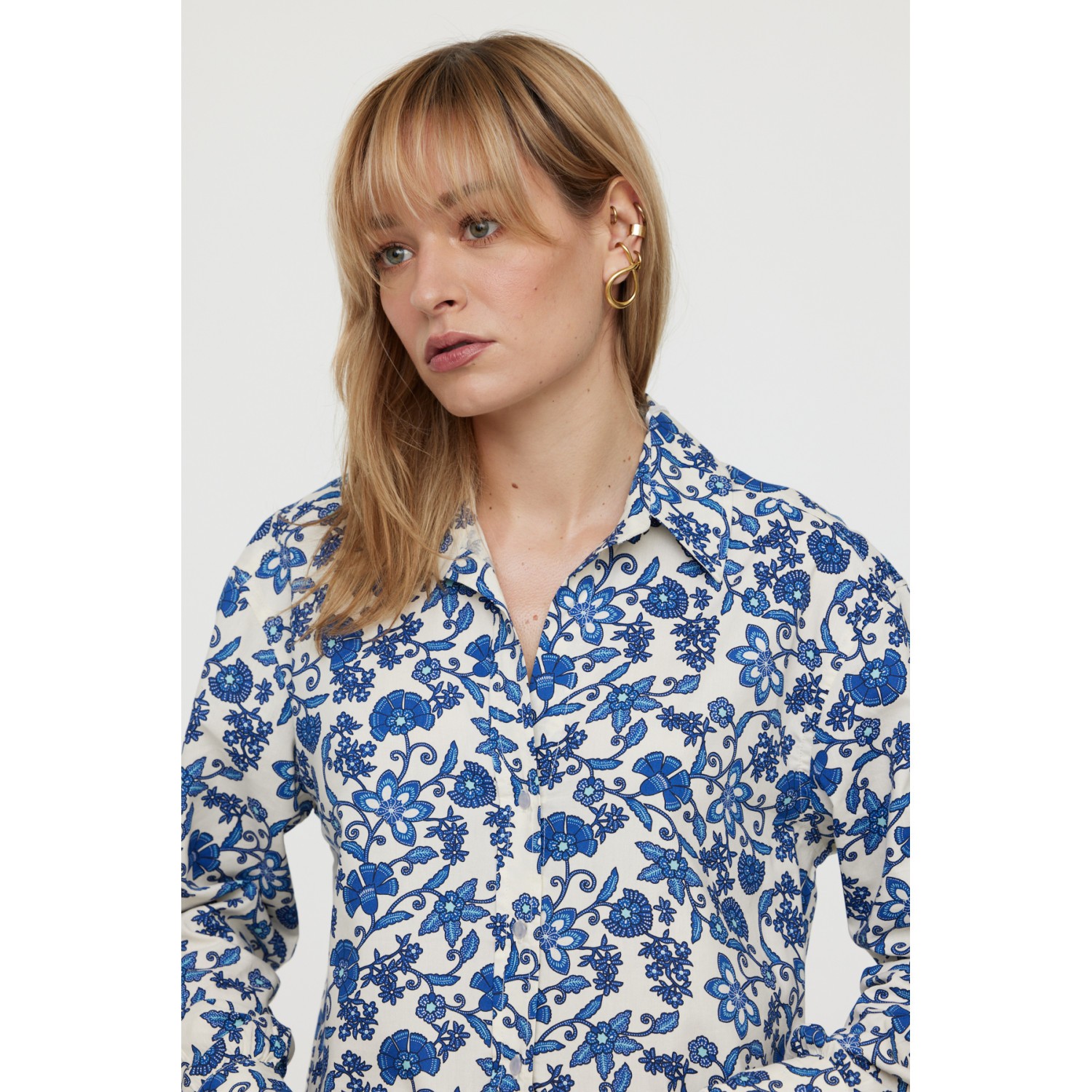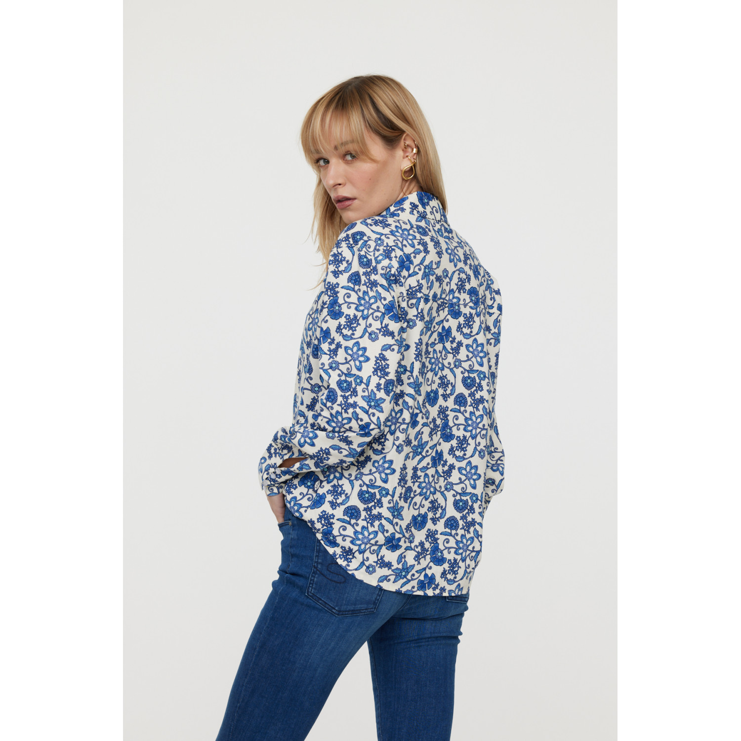 Chemise imprimé fleurs << Inspiration motif porcelaine >> sur un mélange souple en viscose et coton Le mannequin mesure 1.70 cm et porte la taille S
