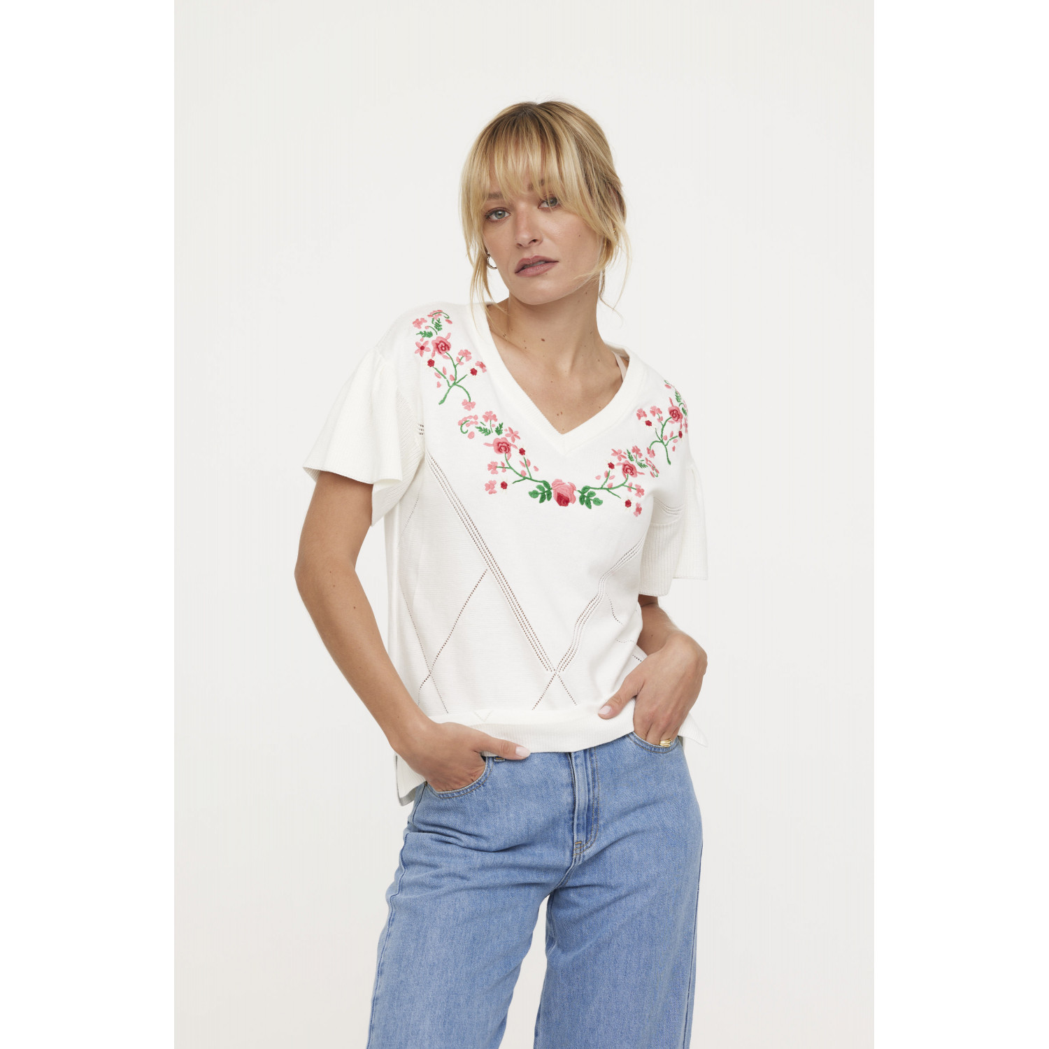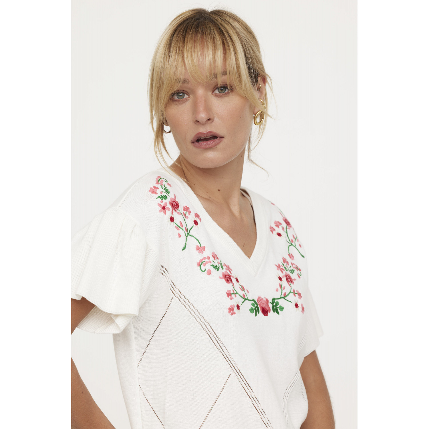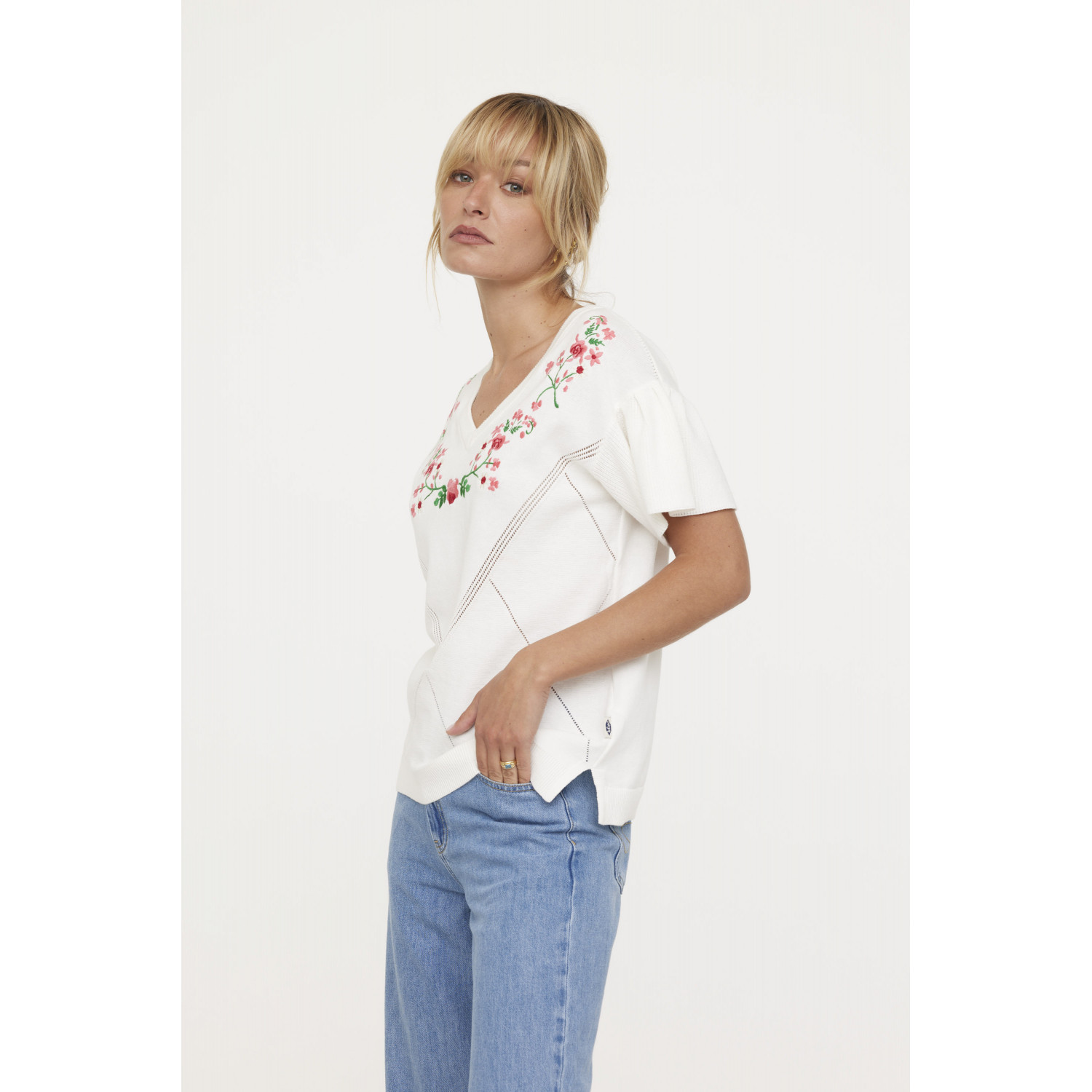 Pull manches courtes évasées et col V avec détail de maille et broderie collerette devant