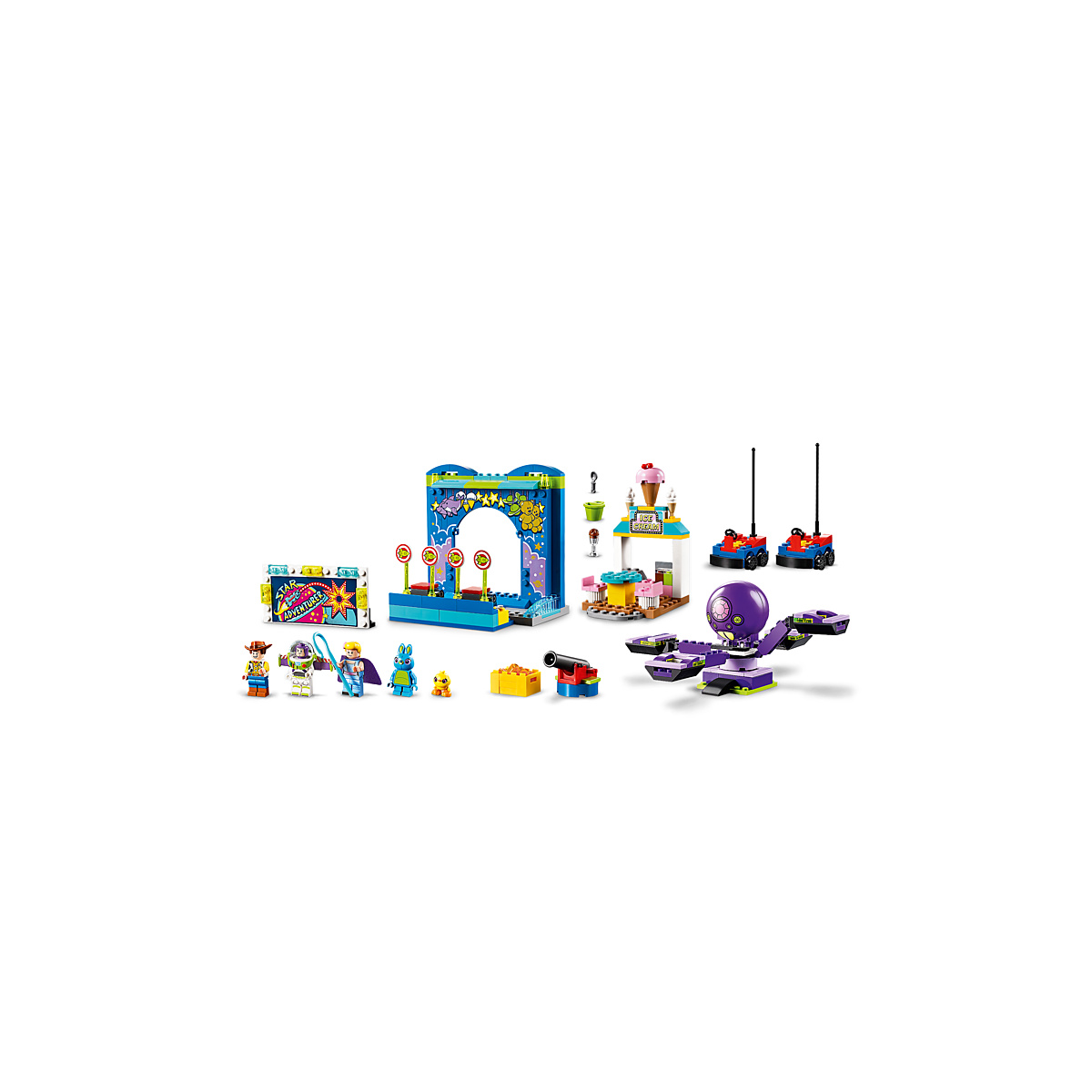 qui permet aux constructeurs novices d'éprouver la fierté de construire des bâtiments, des véhicules et bien plus encore. Ce jouet de construction préscolaire inclut une attraction Terrorantulus avec des bras ajustables, 2 auto-tamponneuses avec un châssis de construction et un magasin de crème glacée avec une caisse, une table, des bancs et un panneau. Le guide inclus pour construire et jouer aidera également votre jeune visiteur de la foire à comprendre la finalité des instructions de montage et à développer son imagination et sa confiance pour une entrée parfaite dans la construction en briques LEGO dans un cadre Toy Story familier. Inclut les figurines de Woody, Buzz LEclair et La Bergère, plus des figurines de Ducky et Bunny LEGO.
