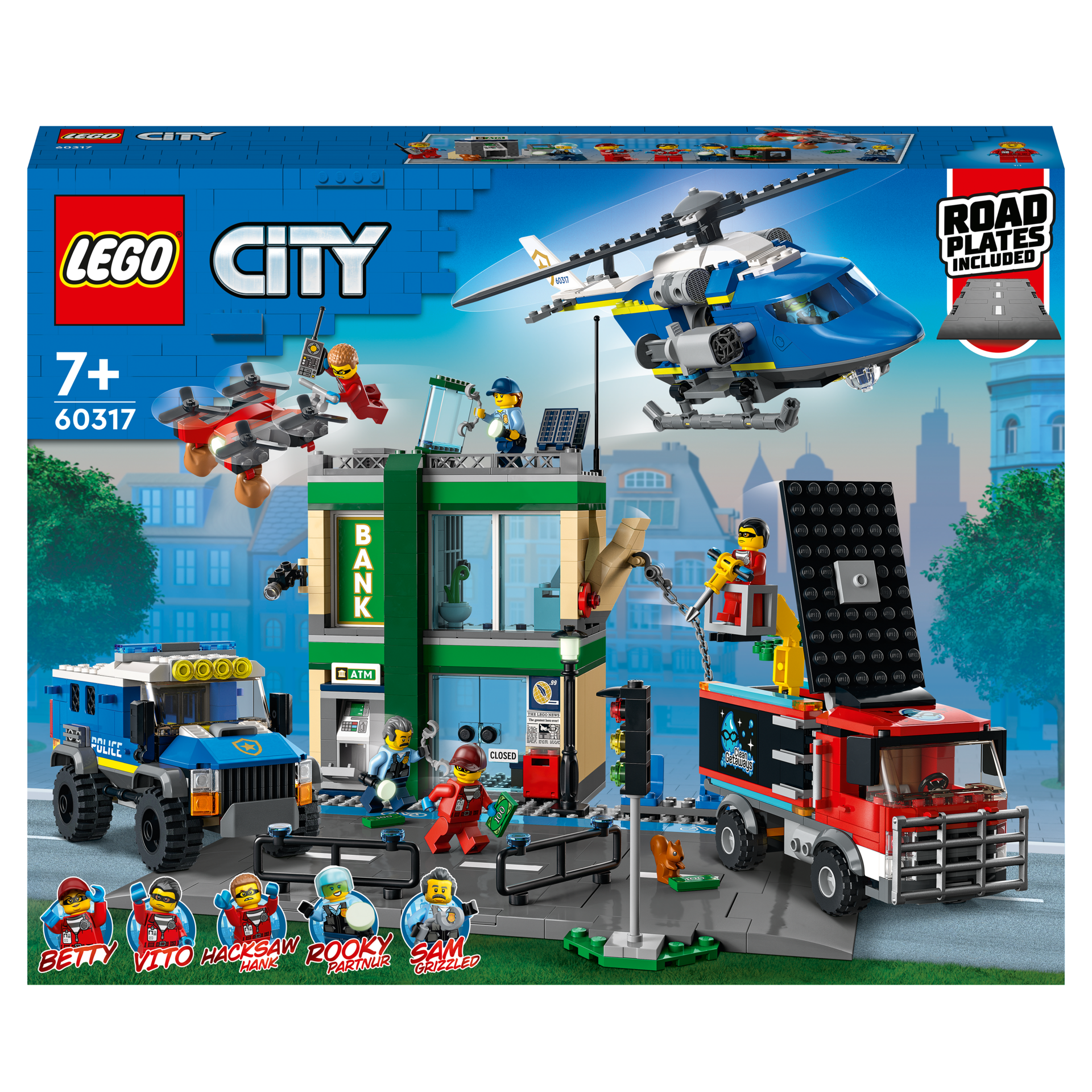 Les enfants passent à laction avec le set La course-poursuite de la police à la banque LEGO® City (60317), qui comprend une banque riche en fonctionnalités, un camion de nettoyage qui se transforme en véhicule de cambriolage, un camion de police et 6 minifigurines, dont 5 célèbres personnages de la série TV LEGO City Adventures. Inclut également un système de plaques de route pour relier le set à dautres modèles LEGO.