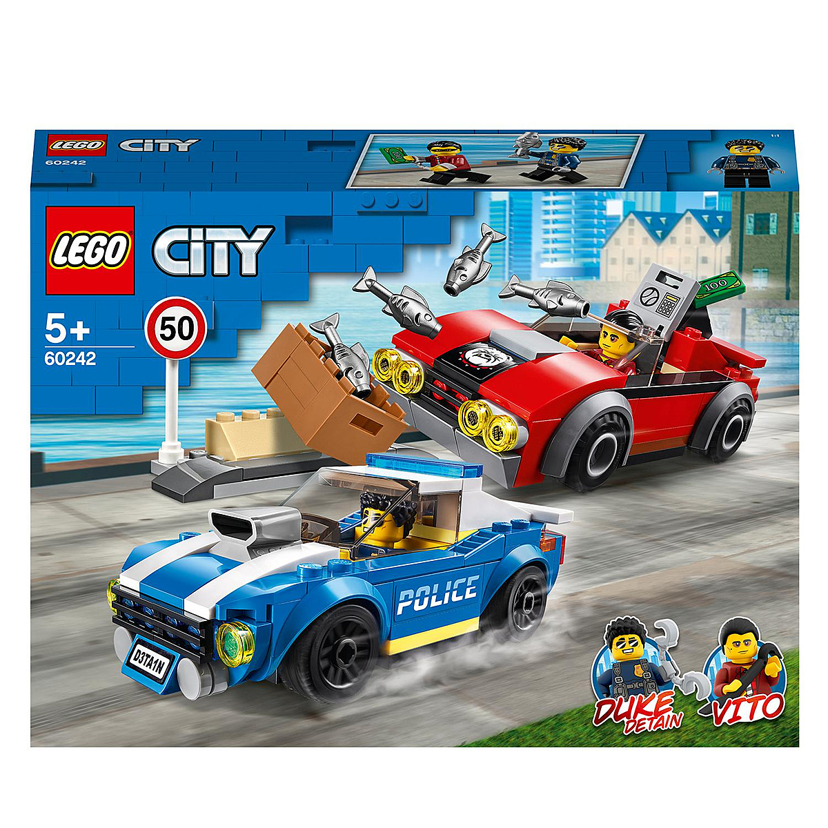 Avec 2 voitures, le héros de LEGO® City Duke DeTain et le voleur Vito, ce jouet LEGO City La course-poursuite sur l'autoroute (60242) plante le décor pour dimpressionnantes aventures de poursuites en voitures. Un beau cadeau pour les enfants qui aiment le jeu de rôle débordant d'action et pour les fans de la série télévisée LEGO City.