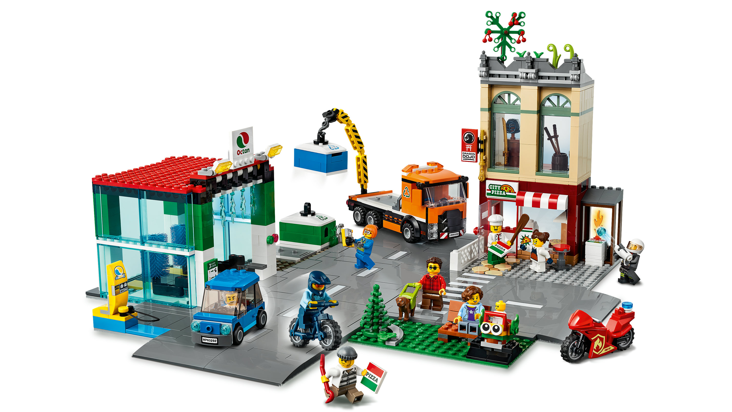 | La boîte contient | • Le set LEGO® City Le centre-ville (60292) présente des bâtiments détaillés, de formidables véhicules et des personnages amusants de la série télévisée LEGO City Adventures. Un cadeau parfait pour les enfants de 6 ans et plus !• Inclut des plaques de route LEGO® et les pièces pour construire une pizzeria, une station de lavage, un dojo, un parc, une station de recyclage, un camion, un véhicule électrique, une moto et un vélo. Inclut 8 figurines, un bébé et un chien guide.• Ce set LEGO® regorge de fonctions réalistes. Les enfants peuvent emmener les véhicules à la station de lavage et faire tourner les brosses de la station, soulever les poubelles de recyclage avec la grue du camion et bien plus encore.• Le centre-ville LEGO® City est un formidable cadeau à offrir pour un anniversaire, Noël ou toute autre occasion aux enfants qui aiment le jeu créatif et aux fans de la série LEGO City Adventures.• Une fois construit, le centre-ville LEGO® City mesure plus de 24 cm de haut, 41 cm de long et 44 cm de large.• Le set inclut divers éléments, tels que des boîtes à pizza et une planche à pizza. Il contient également un ensemble de plaques de route LEGO® permettant aux enfants de l’associer à d’autres sets LEGO afin de construire leur propre ville !• Inclut des instructions papier faciles à suivre et propose Instructions PLUS, disponible dans l’appli LEGO® Instructions de montage pour smartphones et tablettes. Ce guide interactif aide les enfants à maîtriser la construction !• Les sets LEGO® City comprennent des bâtiments colorés, des véhicules fascinants et des personnages amusants qui stimulent le jeu de rôle imaginatif tandis que les enfants créent des aventures infinies dans des décors réalistes.• Toutes les briques et pièces LEGO® sont conformes aux normes industrielles les plus strictes pour garantir qu’elles sont compatibles entre elles et que la construction est amusante et ce, depuis 1958.• Les jouets de construction LEGO® City font l’objet de tests rigoureux pour garantir leur conformité aux normes de sécurité les plus élevées. |