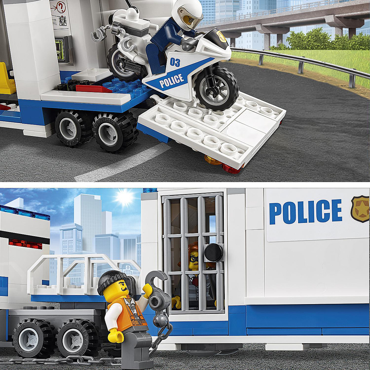 La police de LEGO® City entre en action et arrête lévasion du bandit de la cellule de prison dans le poste de commandement mobile, comprenant une cabine de camion détachable, de la place pour deux figurines, une salle de contrôle avec des écrans, une antenne parabolique, un toit qui s'ouvre, des portes latérales et une rampe arrière, une zone de stockage pour la moto et les outils et une fonction d'évasion de la cellule de prison, plus le tout-terrain des voleurs, Inclut quatre figurines et une figurine de chien policier.