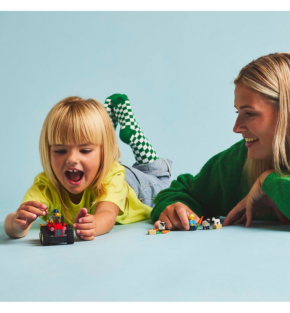 Donnez un air de campagne aux jeux de votre enfant avec le jouet de construction Le tracteur agricole rouge avec remorque et moutons LEGO City (60461). Ce jeu de construction pour les enfants de 4 ans et plus inclut un tracteur rouge avec une remorque amovible, une caisse de carottes et 2 bottes de foin. Ajoutez simplement les minifigurines du fermier et de sa petite-fille, ainsi que les 2 moutons, l’agneau et le chiot pour stimuler l’imagination et le jeu de rôle. Outre une brique LEGO pour le démarrage et des instructions papier illustrées, ce tracteur LEGO facile à construire propose un guide numérique en 3D dans l’appli LEGO Builder. Avec cette aide au montage, les enfants peuvent zoomer, faire pivoter et visualiser leurs maquettes à 360° tout en construisant. Les sets LEGO City incluent des véhicules et engins réalistes, ainsi que des personnages amusants qui inspirent une infinité de scénarios. Ce jouet sur le thème de la ferme peut être combiné avec d’autres sets de la gamme LEGO City (vendus séparément) pour enrichir le jeu créatif. Dimensions – Le tracteur de ce set LEGO City de 116 pièces mesure plus de 5 cm de haut, 9 cm de long et 6 cm de large.