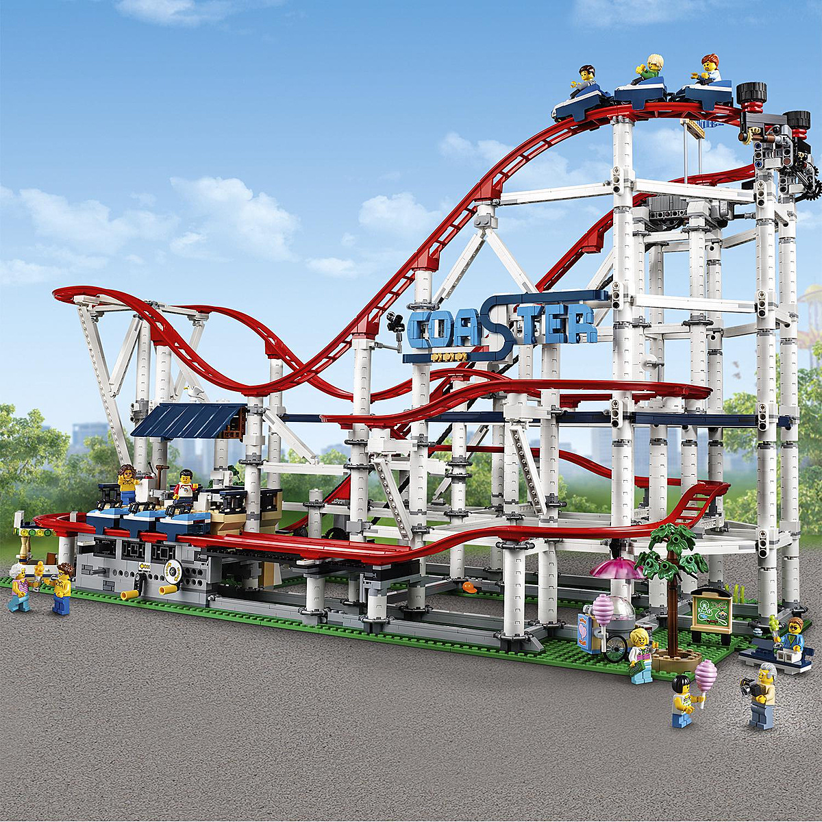 Cet ensemble sensationnel LEGO® Creator Expert Les montagnes russes offre de la vitesse, des sensations fortes et de la joie. Ce modèle avec une rampe de montée mécanique entièrement fonctionnelle comprend 2 trains et de nombreuses fonctions authentiques. Parmi elles un guichet, des stands à barbe à papa et à nourriture, une toise et une station de départ couverte avec des barrières qui s'ouvrent et une console de commande. Les barres de sécurité des passagers dans les wagons peuvent s'abaisser et il suffit de relâcher le frein pour envoyer le train au pied de la première montée. La crémaillère peut enfin être actionnée et la gravité fait le reste du travail tandis que les wagons négocient les bosses et les virages du circuit à toute allure. Ces montagnes russes peuvent être améliorée avec LEGO Power Functions en motorisant la crémaillère, ou avec LEGO BOOST pour ajouter un détecteur de mouvement et des effets sonores réalistes ! Cet incroyable jouet de collection a été conçu pour offrir une expérience de construction stimulante et satisfaisante avec une touche de nostalgie et de charme. Inclut 11 figurines.