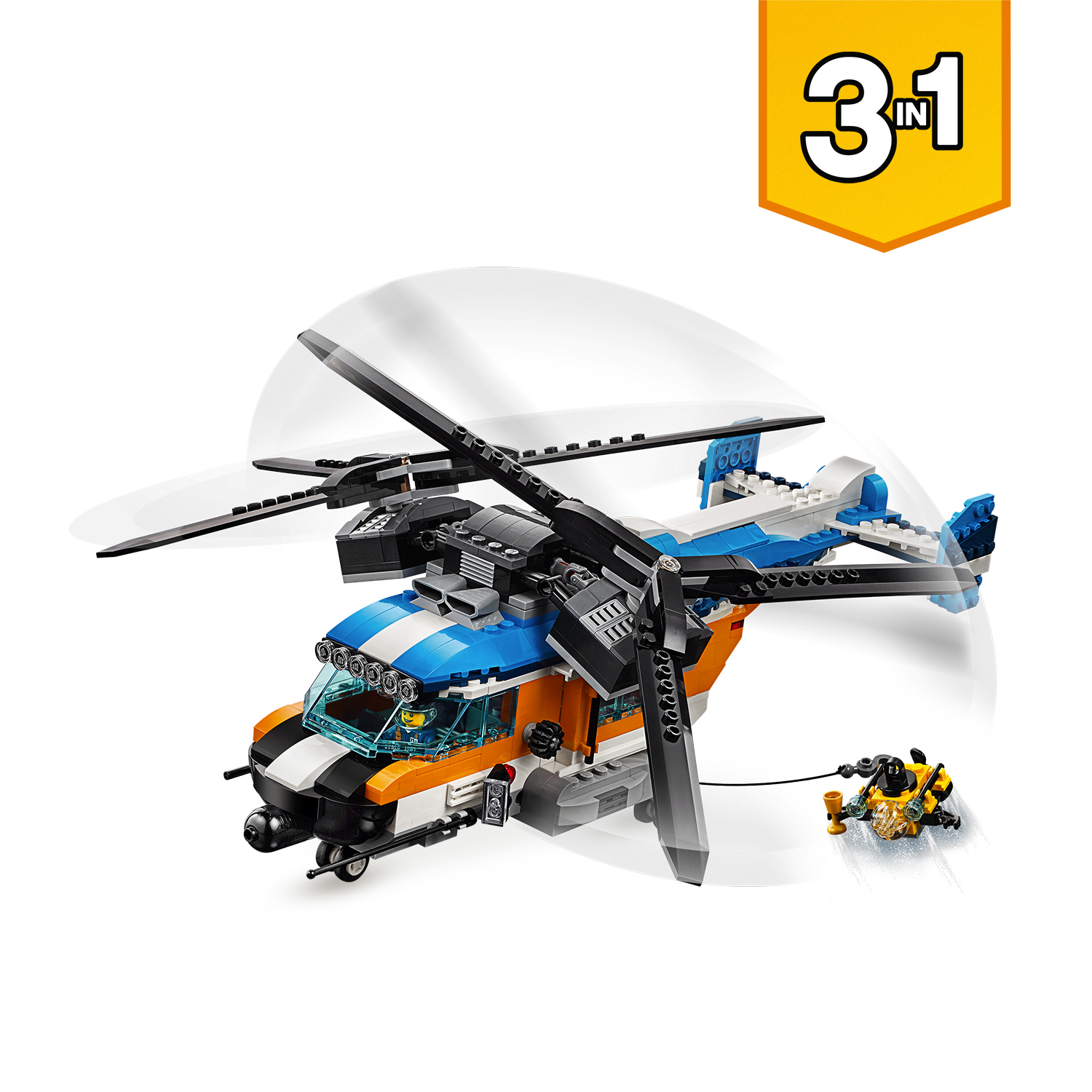 Les enfants se préparent à vivre des aventures à toute vitesse dans les airs et sur l'eau avec l'ensemble L'hélicoptère à double hélice LEGO® Creator 3-en-1 31096, qui comprend deux immenses hélices synchronisées au fonctionnement très réaliste, plus un cockpit aux vitres teintées avec 2 sièges, une porte latérale coulissante et une soute qui s'ouvre. La molette permet de faire tourner les hélices et le treuil permet de charger et décharger le sous-marin robot inclus. Avec les ensembles de jeu LEGO Creator 3-en-1, les enfants s'immergent dans 3 expériences créatives différentes. Ils peuvent construire l'hélicoptère à double hélice, puis le transformer en super jet ou en aéroglisseur pour encore plus de vitesse et d'action. L'ensemble inclut une figurine de pilote, prêt pour l'aventure.
